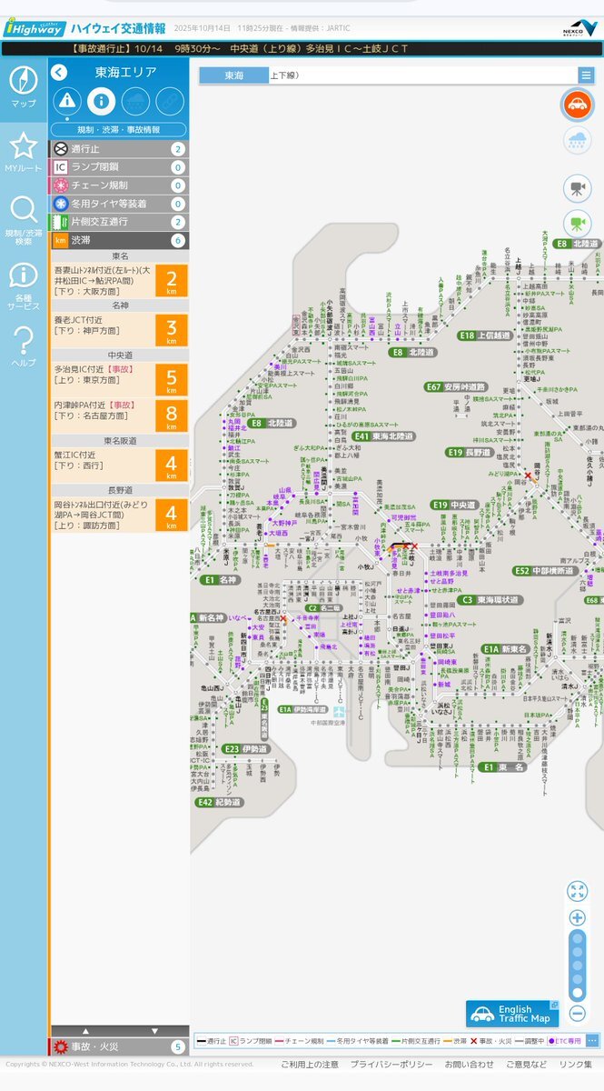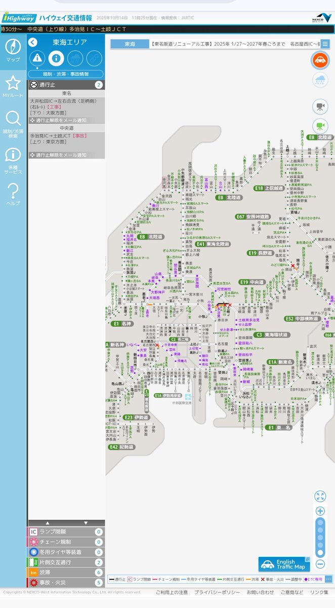 10/14 18:33現在 本日のポストを終了いたします。 岐阜県内の名神高速、中央道、東海北陸道、東海環状道に通行止めはありません。 雨のため路面がぬれている所では、より慎重な運転に心掛けてください。 最新の情報は⇒jartic.or.jp