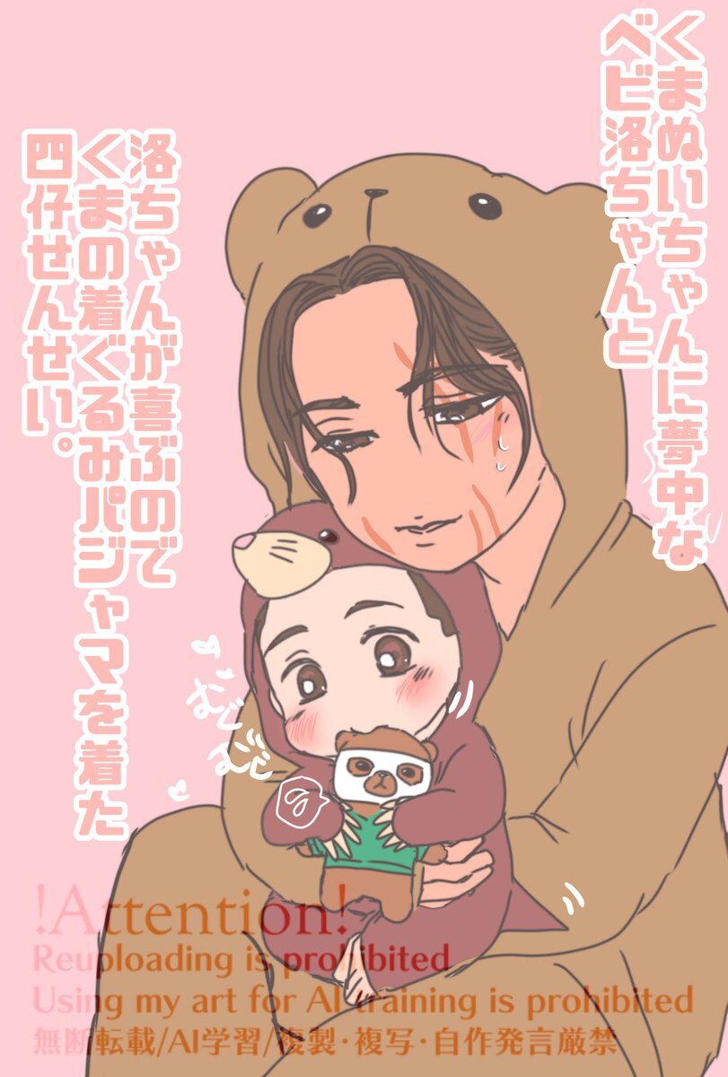 もぐらのロンパースを着た👶洛ちゃんとくまの着ぐるみパジャマを着た4️⃣。 4️⃣「あいつら(ンヤッ、🕛)だけには見られる訳にはいかない…ッ」と思いながら多分このあと無事に?見つかってしまうやつ。 x.com/satoryunmv/sta…
