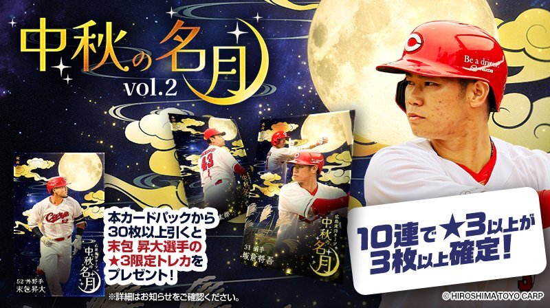 / #カープトレカ 🎏 『中秋の名月 vol.2』販売開始! 🌕 \ 中秋の名月にちなんだトレカの第二弾が登場🌌 #末包昇大 選手の★3限定トレカもぜひGET!✨ 🖋詳細:carp.orical.jp #カープ