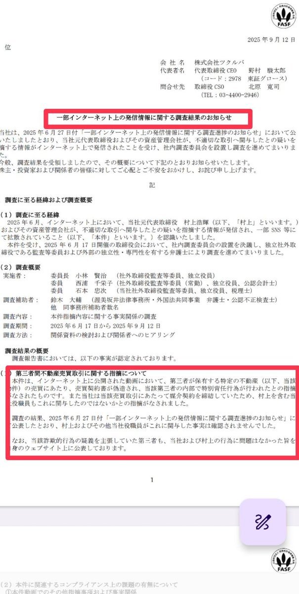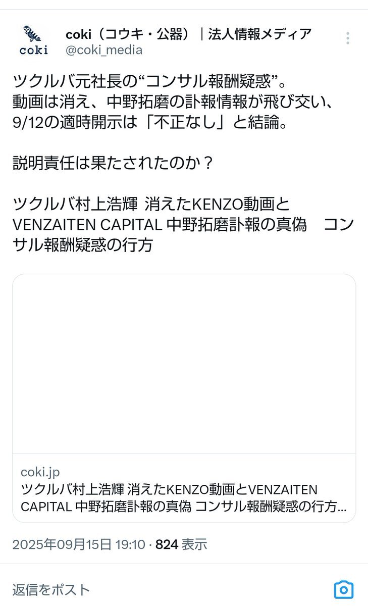 この記事とポストが消えちゃいました😭 【ツクルバ元社長の“コンサル報酬疑惑”。 動画は消え、中野拓磨の訃報情報が飛び交い、 9/12の適時開示は「不正なし」と結論。 説明責任は果たされたのか? ツクルバ村上浩輝 消えたKENZO動画と VENZAITEN CAPITAL 中野拓磨訃報の真偽 コンサル報酬疑惑の行方】 pic.x.com/3hO8CDbxBH