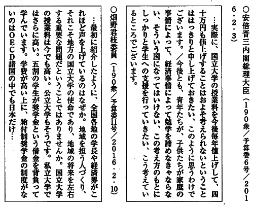 第189回国会で当該の質問をしたのは🧐 日本共産党の畑野君枝議員である つづく第190回国会・予算委員会の答弁等の代表的な個所を示しておこう(議事録:回/院・会議名/番号/年月日) 👉安部総理(当時)答弁 ・国立大学の授業料を今後毎年値上げして、40万円も値上げすることはおよそ考えられない pic.x.com/xYbW4H6n4B