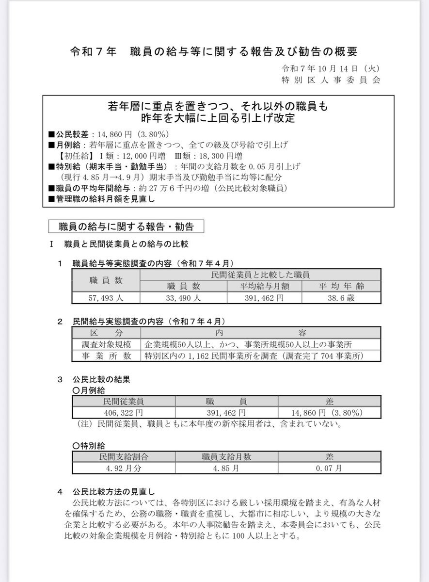 令和7年度特別区職員の人事院勧告が出ました! ・民間との格差3.8%(約14,860円)を踏まえ月給引き上げ ・初任給UP:大卒+12,000円/高卒+18,300円 ・若手からベテランまで全職員が昨年超えの昇給 ・賞与(期末・勤勉手当)も0.05月分増(4.85→4.9月) ・平均年間給与は約27.6万円増 詳細は👇 pic.x.com/CCQHzsYBOl