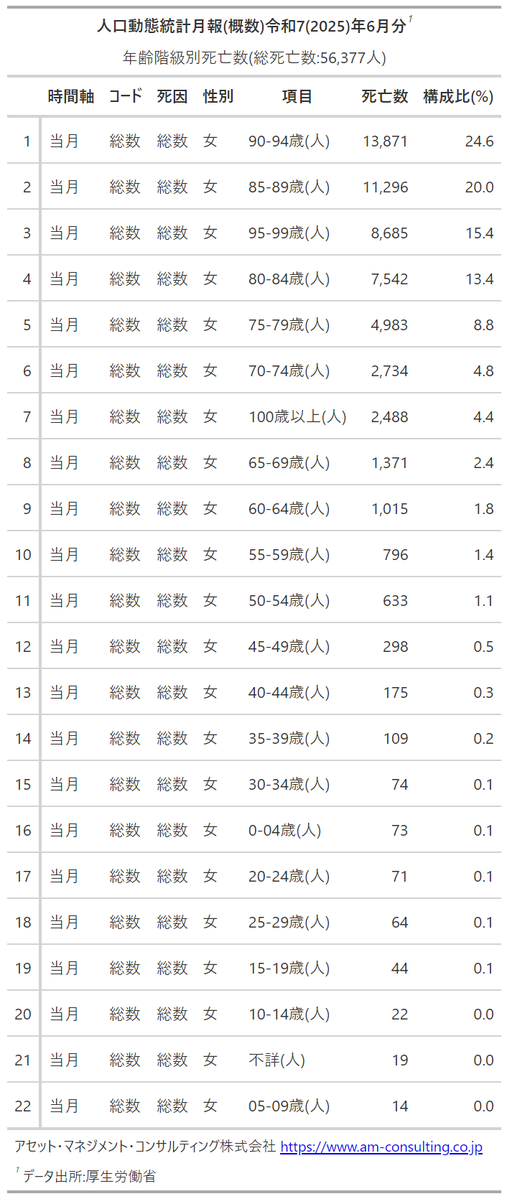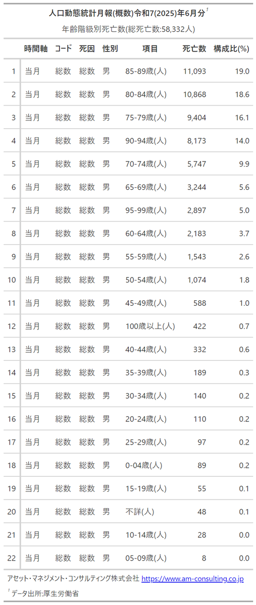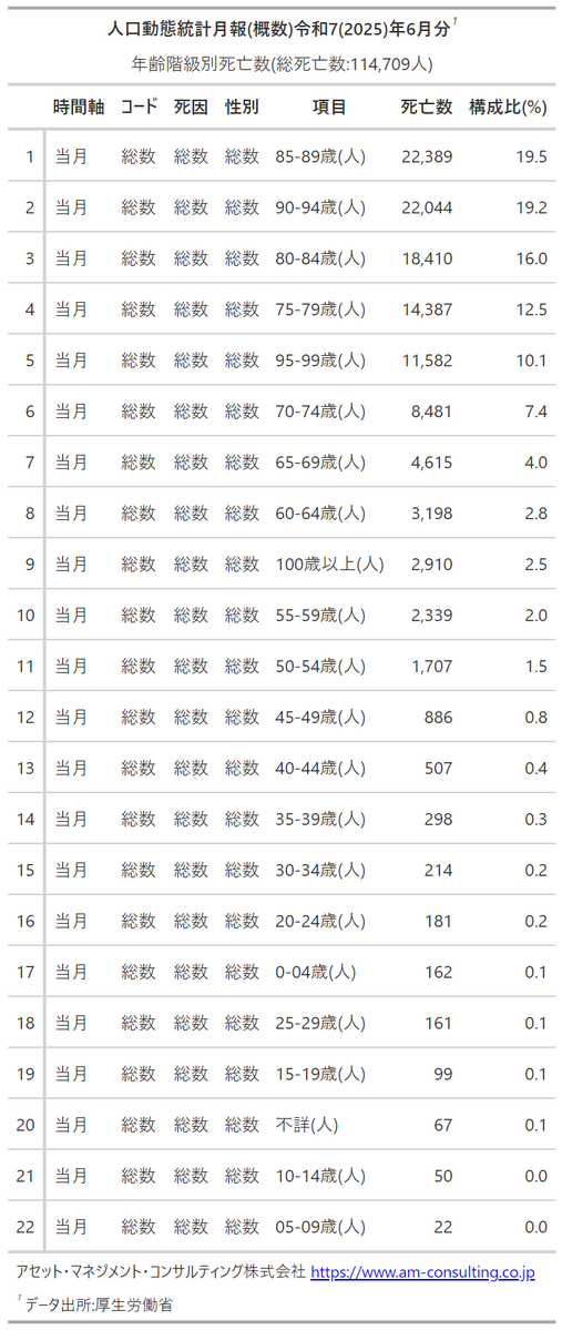 「人口動態統計月報(概数):表番号6 死因・性・年齢階級別死亡数」を更新しました。am-consulting.co.jp/social-jpn-jin… 2025年6月の「日本における日本人」の死亡者総数114,709人を年齢階級別に確認しますと、最多は「85-89歳」の22,389人、構成比は19.5%。次いで「90-94歳」の22,044人、構成比は19.2%。 pic.x.com/6vh0frXsx2