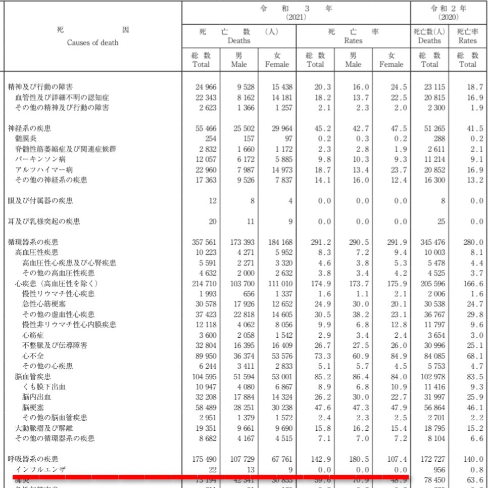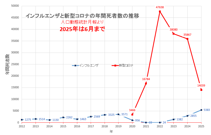 今月発表の厚労省人口動態統計 今年の新型コロナウイルス感染症による死者は1~6月で約1.4万人 去年の同時期と比べて4千人減も未だ年間3万人弱のペース そしてインフルエンザによる死者は去年の同時期と比べて4千人増 数字は偶然の一致でしょうが何にせよ冬に向けマスク手洗いうがい等感染対策の徹底を