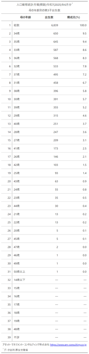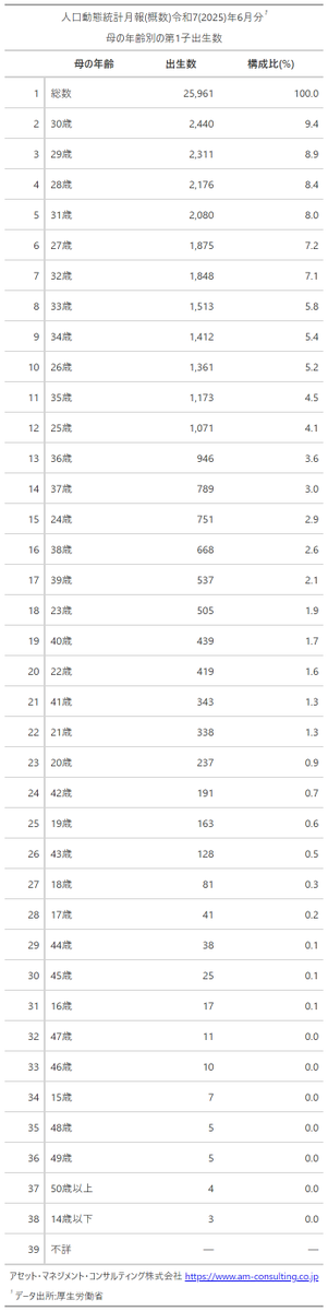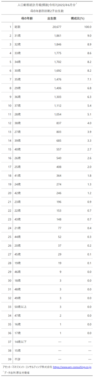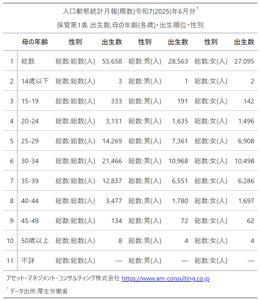 「人口動態統計月報(概数):保管第1表 出生数,母の年齢(各歳)・出生順位・性別」を更新しました。am-consulting.co.jp/social-jpn-jin… 2025年6月の「日本における日本人」の出生数は55,658人。うち、男の子は28,563人、女の子は27,095人。既に男は1468人あぶれています😭 pic.x.com/JEO3I4Z3AL