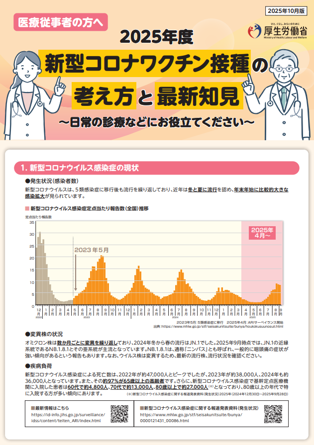 【2025年度 #新型コロナワクチン 接種の考え方と最新知見を整理したリーフレットを作成しました】 新型コロナウイルス感染症の現状やワクチンの有効性と安全性等について詳しく記載しています。 診療を行う医療従事者や関係者の皆さまにおかれては、ぜひご活用ください。 mhlw.go.jp/content/109000…