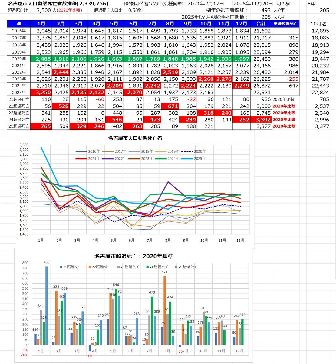 【名古屋市人口動態統計速報死亡者数 令和7年10月分】 2021年以来の人口に対する超過死亡者数比率:0.58% 超過死亡者数:221人⇒補正後:16人(=221ー205) 死亡者数:2,163人 city.nagoya.jp/shisei/categor… pic.x.com/G15LLp4Iq9