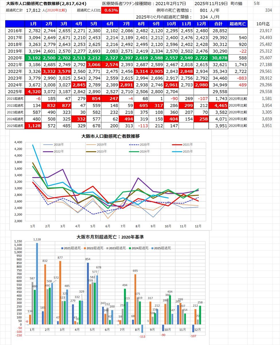 【大阪市人口動態統計速報死亡者数 令和7年10月分】 2021年以来の人口に対する超過死亡者数比率:0.63% 6月以降、超過死亡閾値(334人)以下‼ 超過死亡者数:147人⇒補正後:147-334=-187人‼ 死亡者数:2,704人 city.osaka.lg.jp/toshikeikaku/p… pic.x.com/nBfHTL9g4r