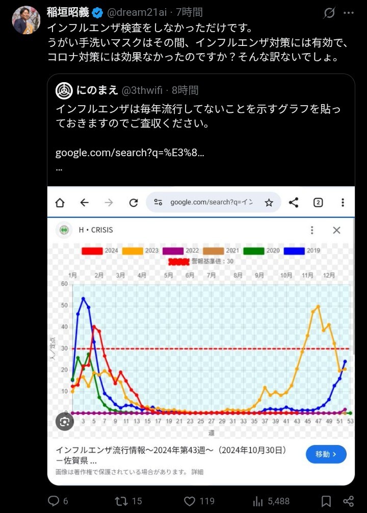 「病気を警戒しなくていい」は どうあれ公衆衛生の敵でいいだろ・・・ あと新型コロナは22、23,24と 「3年連続で3万人」以上死んでるぞ。 >人口動態統計 次は「1年で3万人程度なら警戒するな」か? 自分が何いってるか理解してるだろうか?
