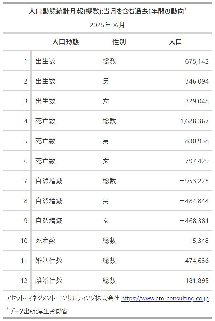 「人口動態統計月報(概数):当月を含む過去1年間の動向(出生数、死亡数、死産数、婚姻件数、離婚件数)」を更新しました。am-consulting.co.jp/social-jpn-jin… 2024年7月から2025年6月までの「日本における日本人」の出生総数は675,142人。男は346,094人、女は329,048人。 pic.x.com/jxAqMcUIoC