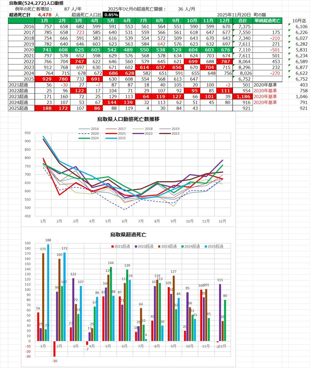 【鳥取県人口動態統計速報死亡者数 令和7年10月分】 2021年以来の人口に対する超過死亡者数比率:0.85% 超過死亡者数:43人⇒補正後:7人(=43-36) 死亡者数:647人 pref.tottori.lg.jp/275032.htm pic.x.com/QvPzqpsWkg