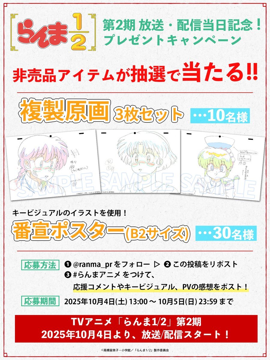 \プレゼントキャンペーン❗️/ 複製原画やポスターが 合計40名様に当たる!✨ 応募は… 1⃣@ranma_pr をフォロー 2⃣この投稿をRP 3⃣Xで #らんまアニメ をつけて イベントや生配信、アニメ本編などの 感想や実況コメントをポスト 投稿するほど当選確率UP🐼 ☑️応募は10/5(日)23:59まで