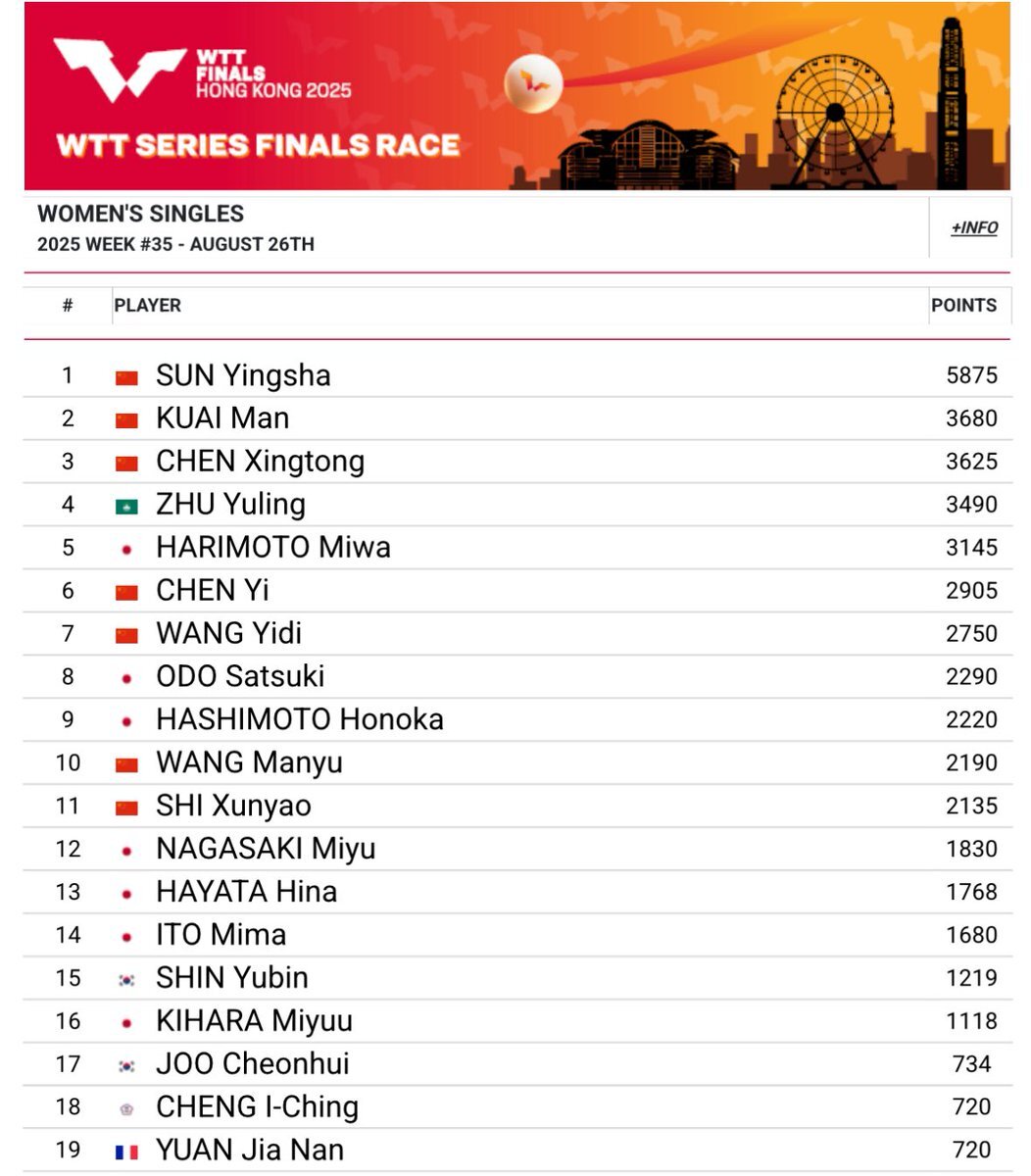 WTT Finals Race🇭🇰 #12 早田ひな🇯🇵 2,033pt #13 申裕斌🇰🇷 1,934pt #14 長﨑美柚🇯🇵 1,920pt #15 伊藤美誠🇯🇵 1,860pt #16 木原美悠🇯🇵 1,118pt ——————————————— #17 朱芊曦🇰🇷 1,099pt #18 スッチ🇷🇴 845pt #19 何卓佳🇨🇳 834pt 以上800pt以上の選手 x.com/aphallead_tt/s…