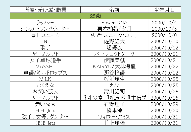 今月25歳: Power DNA 栗本柚希/夕月 荻野・ユニーク・コッ子 佐野雄大 堀優衣 伊藤美誠 大林海龍 那谷柊優 板垣瑞生 えな 清川雄司 石野理子 橋本涼 ウィロー・スミス 井上瑞稀 pic.x.com/RrLfMCr0Em