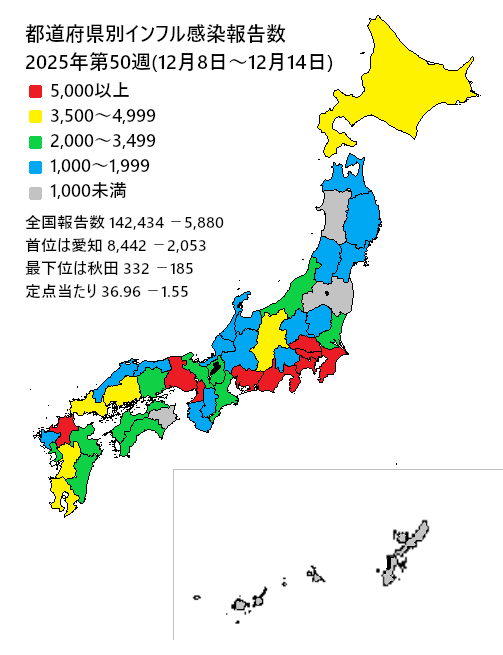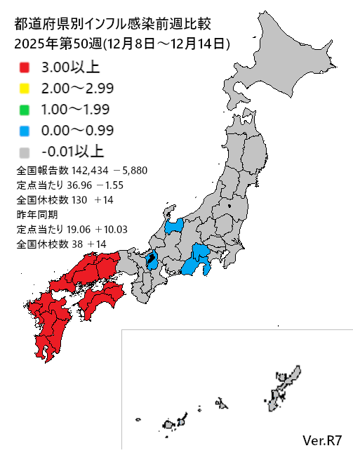 ③インフルエンザ2025年第50週(12月8日~12月14日) 出展:mhlw.go.jp/content/001615… 全国報告数 142,434 -5,880 定点当たり36.96 -1.55 全国休校数130 +14 昨年同期定点19.06 +10.03 昨年全国休校数38 +14 #厚生労働省 #インフルエンザ #休校 #学級閉鎖 pic.x.com/F4m8yx986m