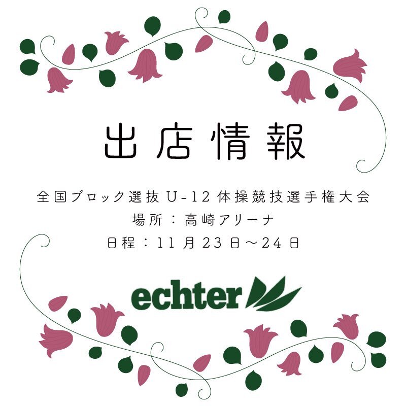 ⭐︎⭐︎出店情報⭐︎⭐︎ . 全国ブロック選抜U-12体操競技選手権大会に出店いたします! . 場所は高崎アリーナです◡̈* 11月23日〜24日の二日間となります。 . たくさんの方々にお会いできることを楽しみにしています♪ #echter #gymnastics #体操 #leotard #u12 #全国ブロック選抜u12体操競技選手権 pic.x.com/4QAUi2YUE5