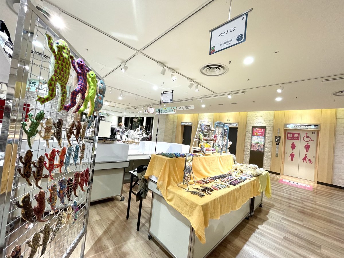 梅田阪神 みんなの手づくり作品展 前日搬入して来ました✨ 什器を減らしたので、メッシュパネルにズラリと並べました🦎✨ 時間が足りず、また明日の朝早くに設営します。 pic.x.com/dFpavuxyD3