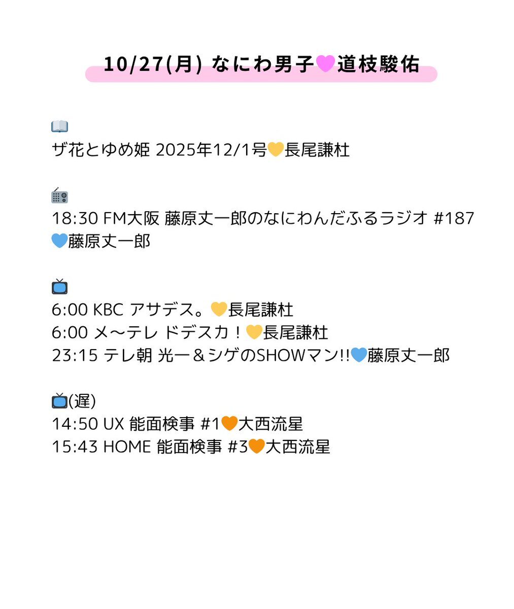10/27(月) なにわ男子👦🏻🫧 日刊なにわ男子🩷道枝駿佑 📖 ザ花とゆめ姫 2025年12/1号 💛長尾謙杜 📻 18:30 FM大阪 藤原丈一郎のなにわんだふるラジオ #187 💙藤原丈一郎 📺 6:00 KBC アサデス。 💛長尾謙杜 6:00 メ~テレ ドデスカ! 💛長尾謙杜 23:15 テレ朝 光一&シゲのSHOWマン!! 💙藤原丈一郎 pic.x.com/P6uWHPB1Pm