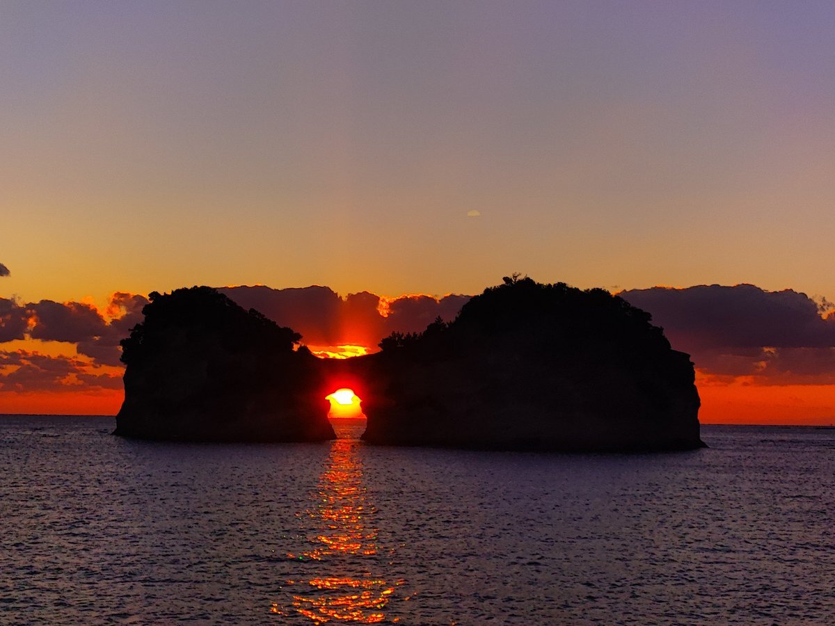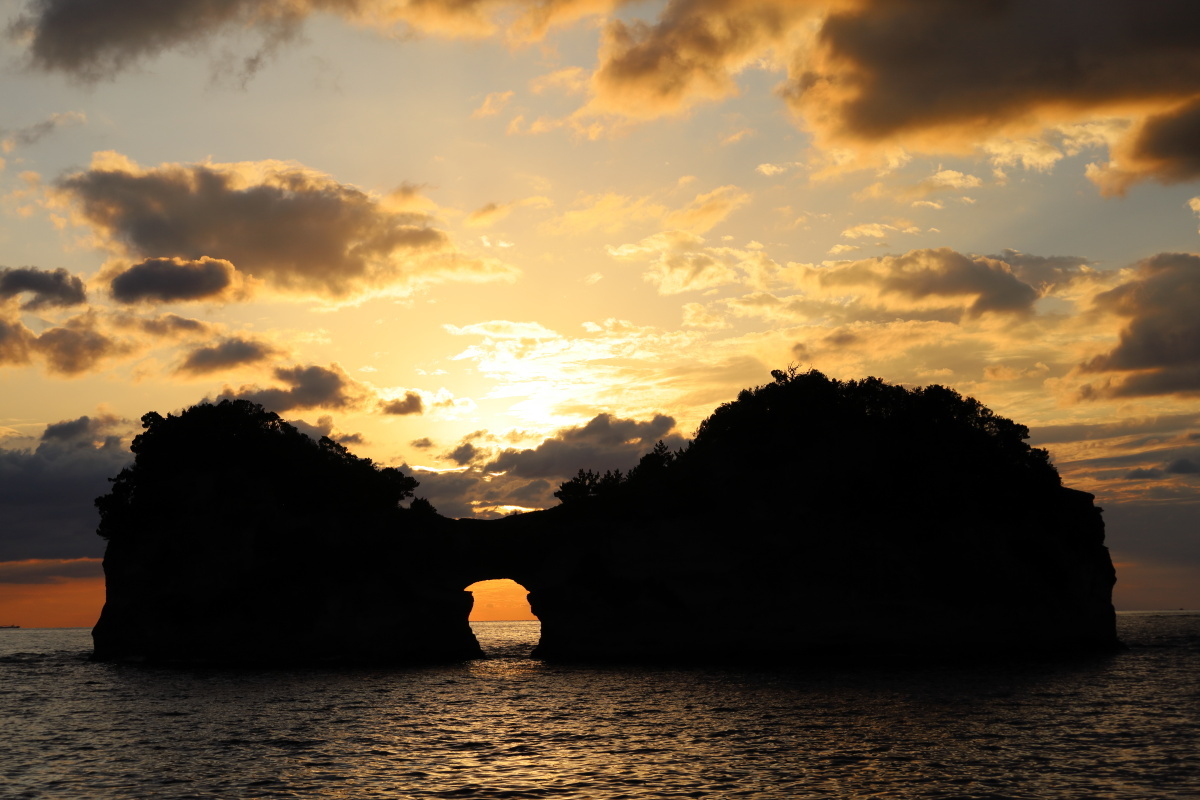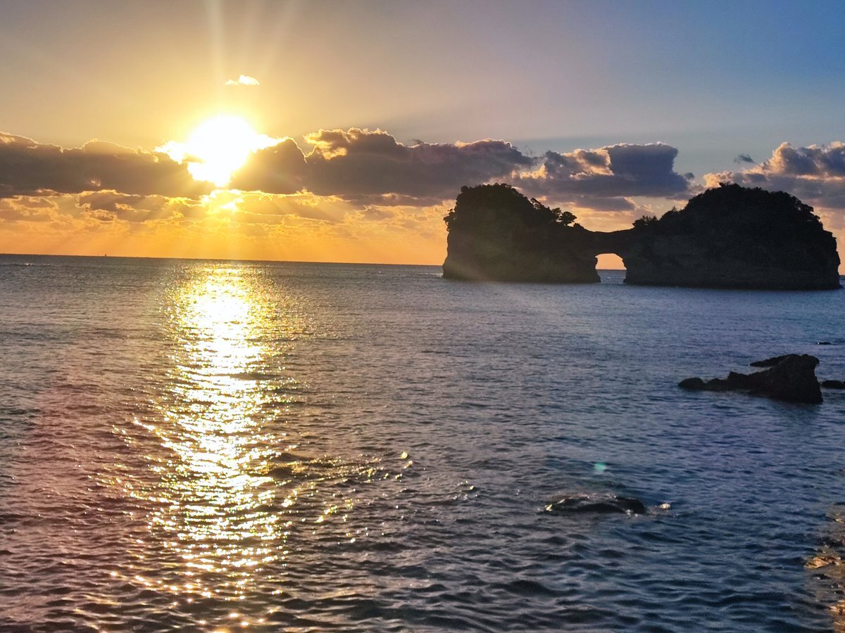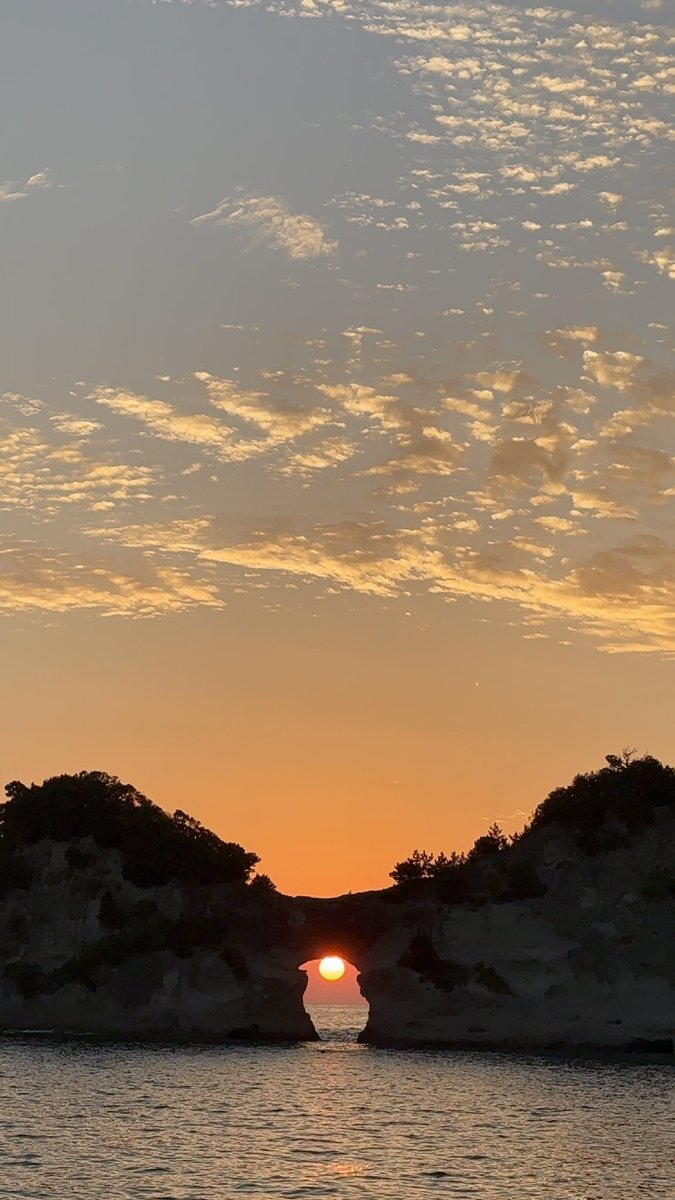 返信先:@WaFFsdzAiNop大勢の人が円月島の夕日を楽しんだ 円月島(えんげつとう),正式名稱為高嶋(たかしま),是位於日本和歌山縣西牟婁郡白濱町臨海浦的一座無人島,被指定為日本的國家名勝。 它是白濱的象徵之一,以其獨特的海蝕洞景觀而聞名,該海蝕洞位於島嶼中央,形狀宛如滿月,這也是「圓月島」名稱的由來。 pic.x.com/gSaAkunk1b
