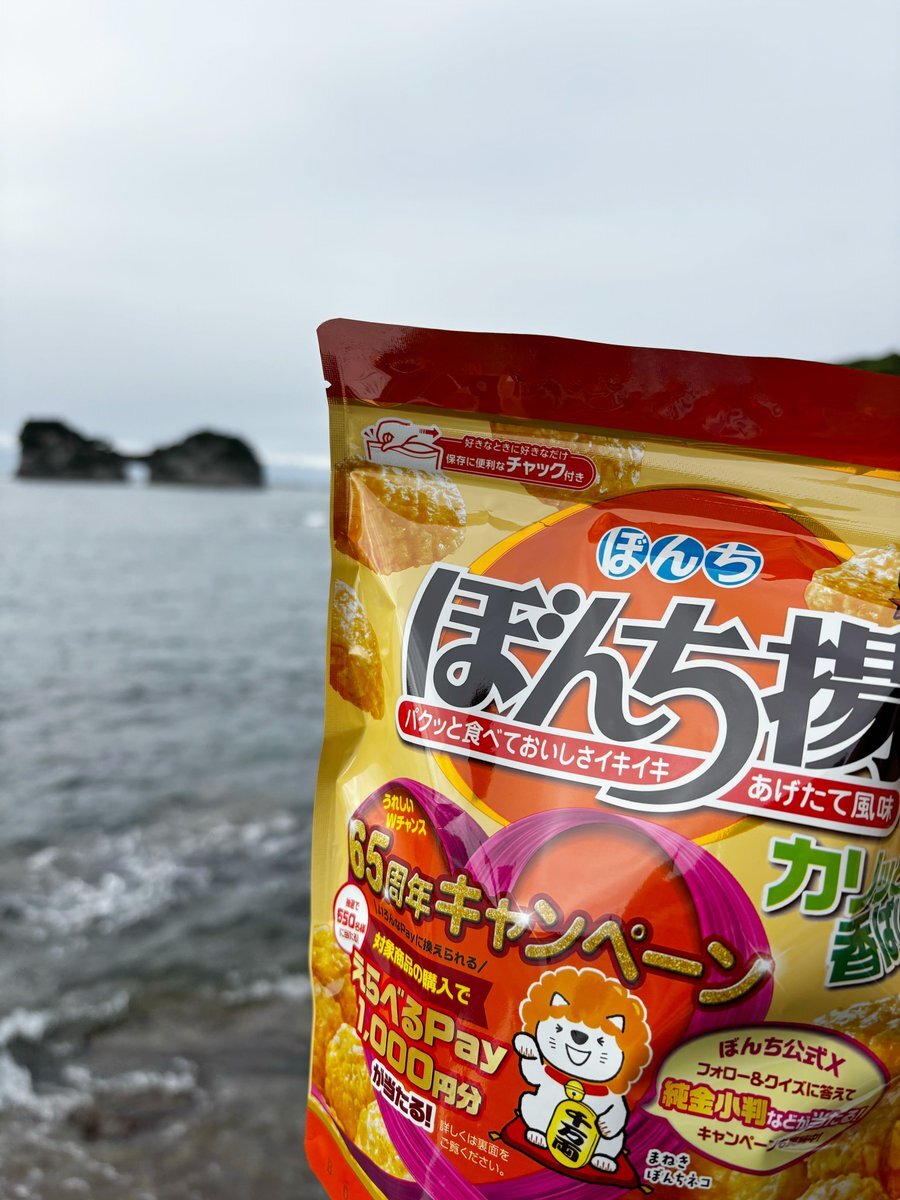 クイズの答えは「揚小丸(あげこまる)」 1960年に「揚小丸(あげこまる)」の名称で販売を開始 1963年に「ぼんち揚」と改名されたんですね🐈🏅 海を見ながらぼんち揚を食べてたら、円月島に上手くフィットしそう…と思って撮影した写真です🌕😼笑 pic.x.com/vJhOvS4DZA x.com/bonchiage_jp/s…