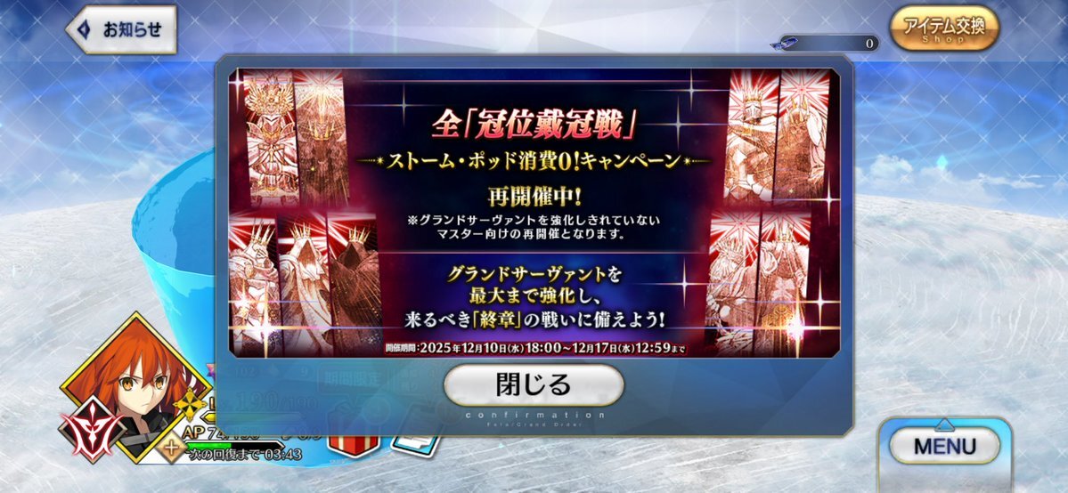 冠位戴冠戦延長ですか?レイドもありますよね?全鯖pu?素材も石もリンゴも消えますよ?