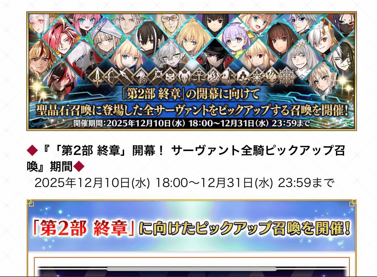 正月までスタッフ登壇番組は無いって話だから冠位戴冠戦後にイベントは無いと思うけど、何かしらはやるよね多分 ・終章開幕直前キャンペーン(最終回豪華版) ・全鯖pu ・メモクエ ・幕間、強化クエ、アドバンスドクエ等の滑り込み追加 ・冠位戴冠戦が全部無料(これは事前告知ないから微妙) この辺…?
