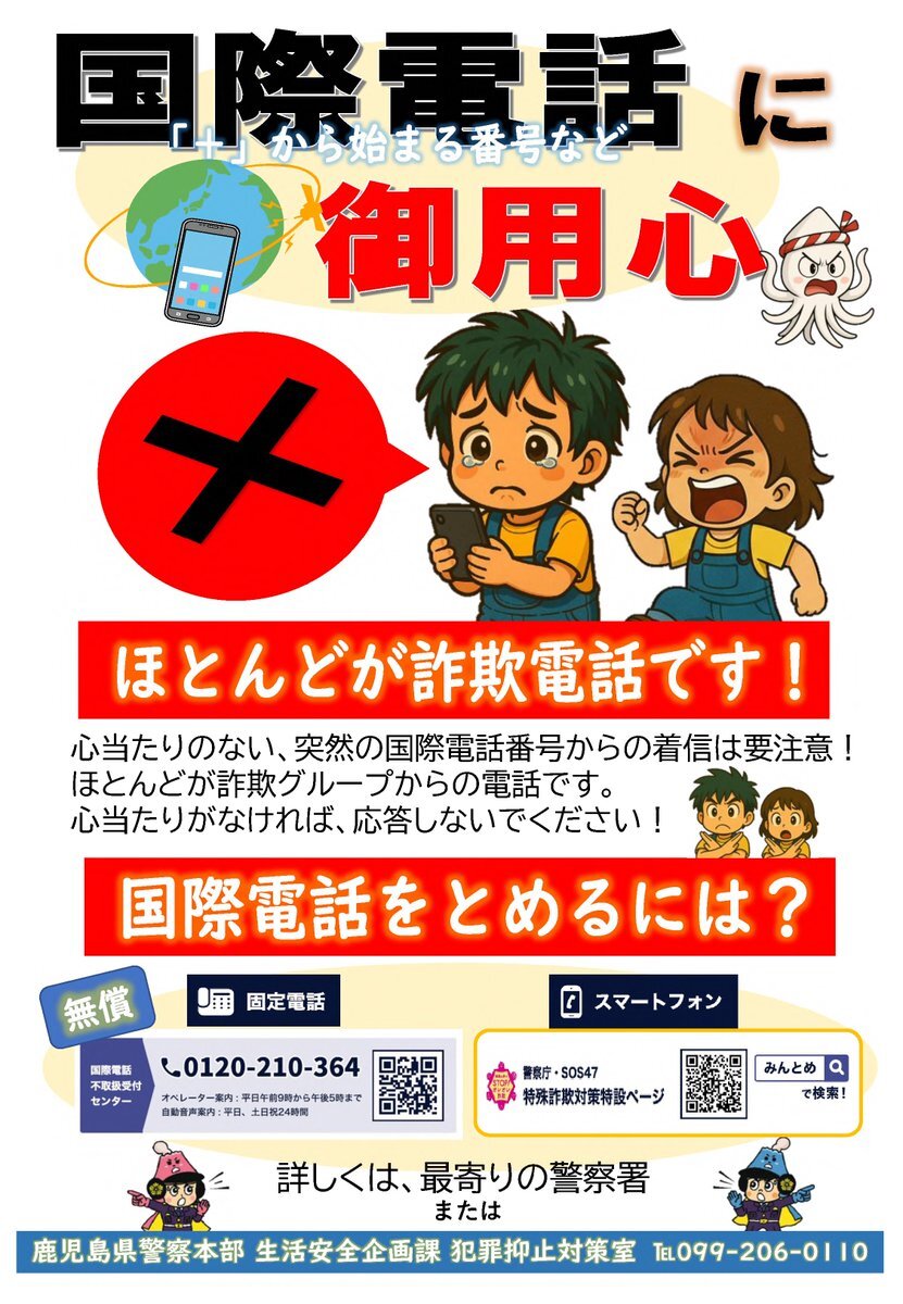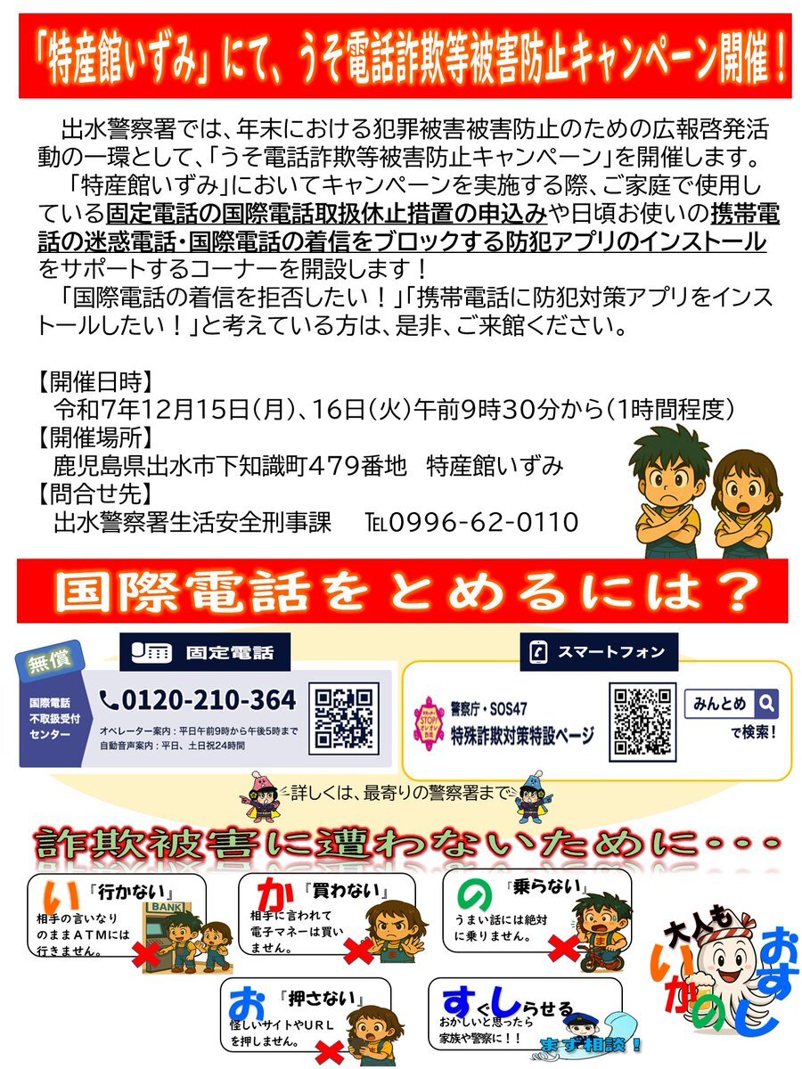 【出水警察署:特産館いずみでキャンペーン】 令和7年12月15日(月)、16日(火) 午前9時30分から1時間程度! 出水市知識町 特産館いずみ 国際電話不取扱に関してブースを設け、みなさまのサポートをいたします! #うそ電話詐欺 #特殊詐欺 #SNS型 pic.x.com/TyueHhjBXP
