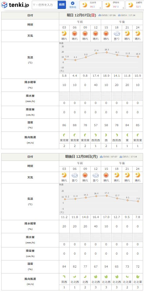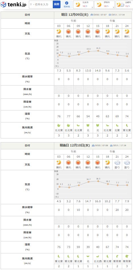 tenki.jp および weathernews.jp による鹿児島県出水市の天気予報。今朝の冷え込みは厳しかった。隣市のアメダスは最低気温は1度と、本格的な冬の寒さ。明日は、今日ほどではないようだが、朝方はだいぶ寒いだろう。日中の気温はだいぶ上がりそうだ。 x.com/taku_ja6rpj/st…