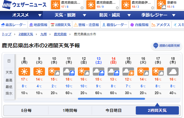 tenki.jp および weathernews.jp による鹿児島県出水市の天気予報。今朝はそれほど冷え込まなかったが、明日・明後日の朝はある程度気温は下がりそうだ。その後はそれほど強い冷え込みはしばらく無い見込み。おおむね平年よりも高い気温で推移するようだ。 pic.x.com/J7RbSoffaB x.com/taku_ja6rpj/st…