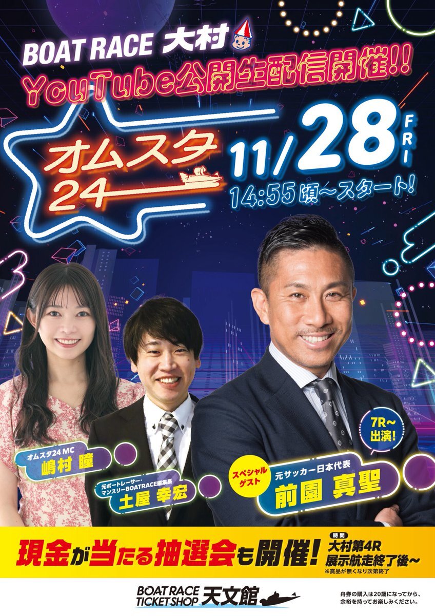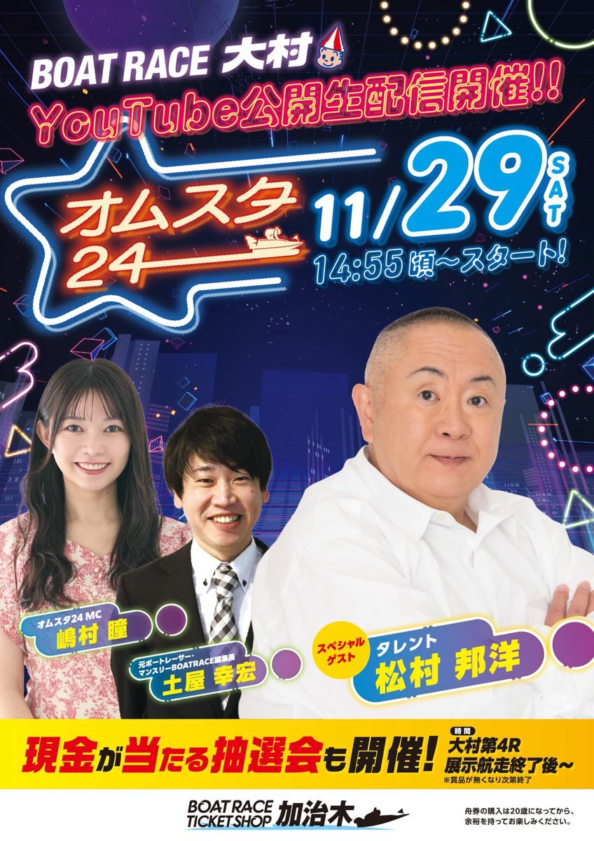 #ボートレース大村 🚤 大村公式YouTube番組 #オムスタ24 またまた公開生配信✨鹿児島へ行きますよ😊 GⅢの11/28ボートレースチケットショップ天文館でゲストは前園真聖さん⚽️、11/29ボートレースチケットショップ加治木でゲストは松村邦洋さん🌙 pic.x.com/iqiWyxLmce