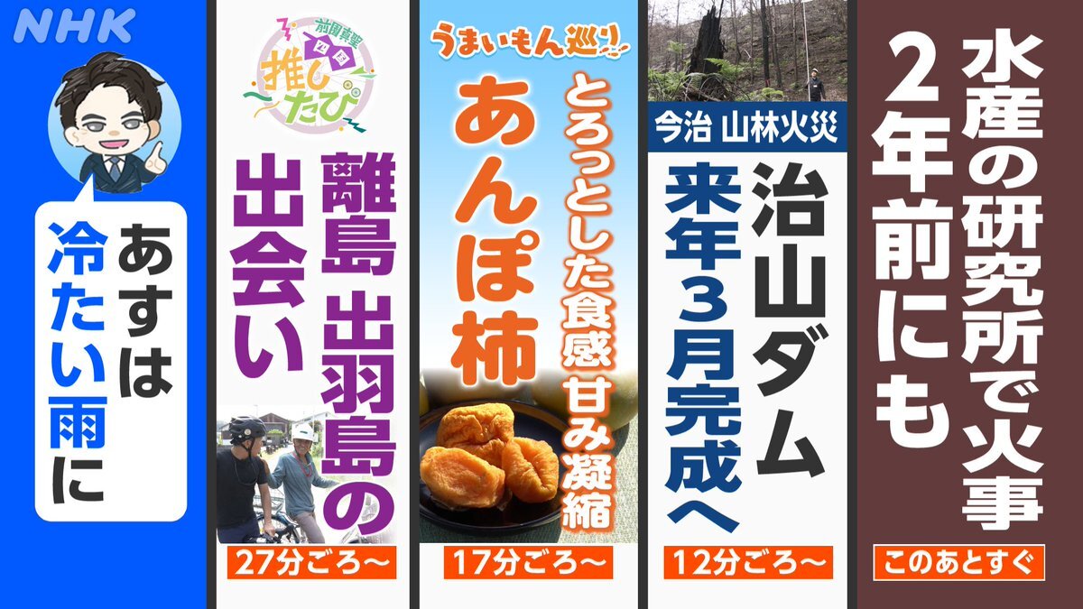 11月12日(水) 愛媛のニュースをチェック ✅今治 山林火災 治山ダム来年3月完成へ 😋西条 特産の干し柿「あんぽ柿」 🚴🏻♂️前園真聖さん 出羽島へ 🌡気象情報 「13日(木)は冷たい雨☔に」 ほか 📱#ひめポン! 見逃し配信はこちら web.nhk/tv/an/himepon/… pic.x.com/pEMY56JeGn