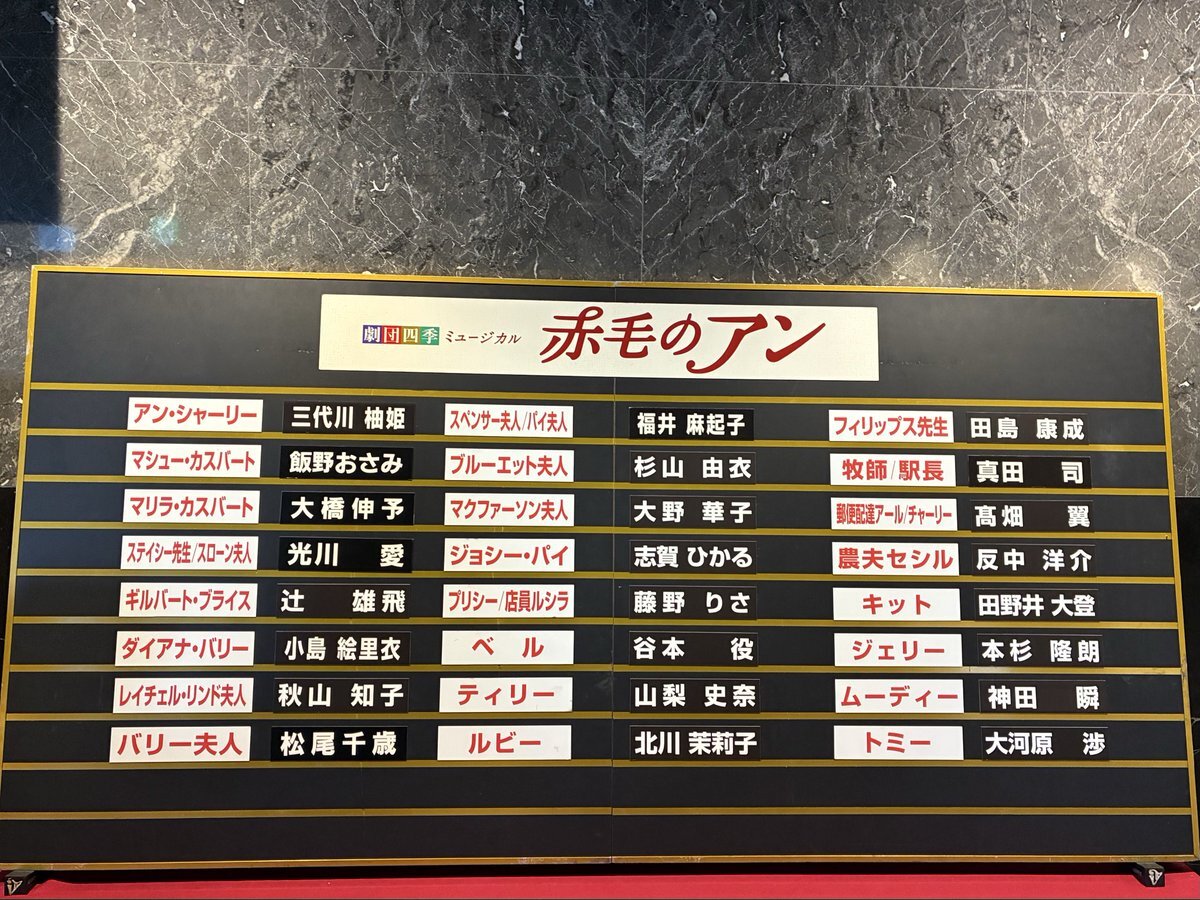劇団四季「赤毛のアン」観劇🎭 アン可愛い💕 マシューいい人、マリラに親近感 🍨の歌、楽しい🎵 時代や学校制度の違いで子どもに見せていいのか不安なセリフやシーンはあった😅 原作は冒頭の極一部しか知らない。ミュージカルを見て、全部を読みたいと思った #劇団四季 #赤毛のアン #ミュージカル pic.x.com/vPDWx0tJYG
