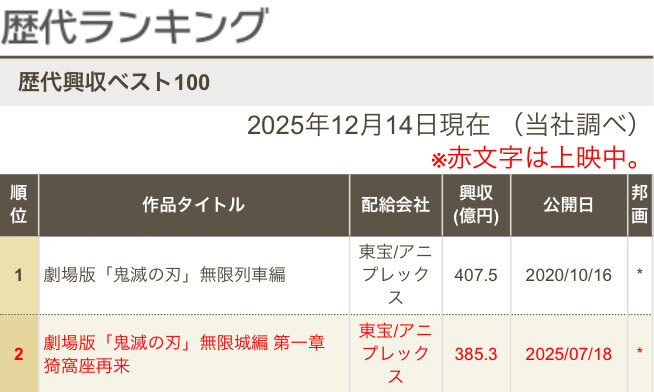 劇場版『鬼滅の刃 無限城編 第一章 猗窩座再来』(7.18公開)の公開150日間での興収が385.3億円を突破した。国内歴代1位となる興収407.5億円を突破した『劇場版「鬼滅の刃」無限列車編』(2020.10公開)は公開150日間で興収386億円を記録しており、遂にペースダウンとなった。oricon.co.jp/news/2425038/f… pic.x.com/4sP3D9vE2r