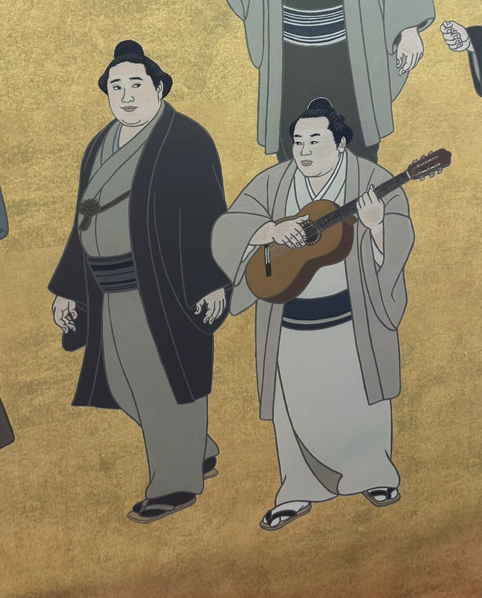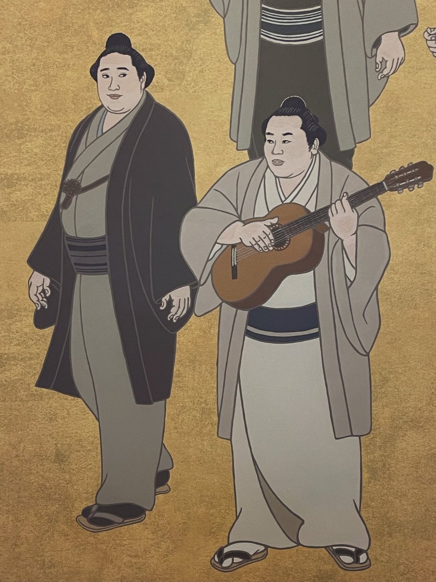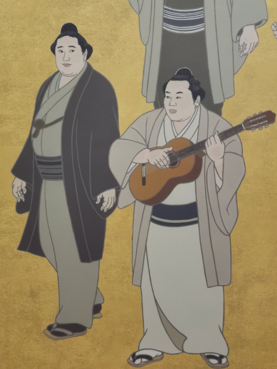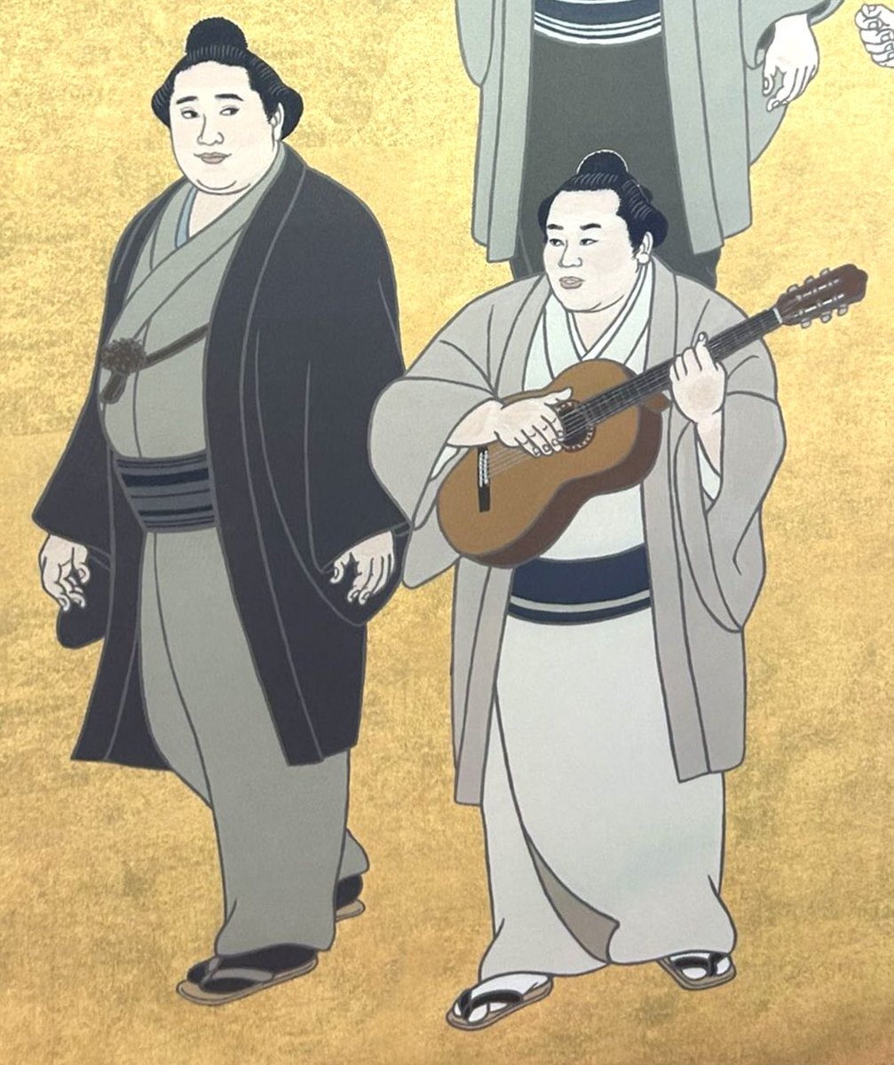 返信先:@wei_loveStella楽器を持っている玉の海の左が北の富士さんだと思います! 弾いたり歌ったりできたハイカラ横綱コンビ。 錦絵は左上からUターンして左下まで、歴代順に描かれているので、左が52代の北の富士さん、楽器を持っているのが51代の玉の海さんかと。