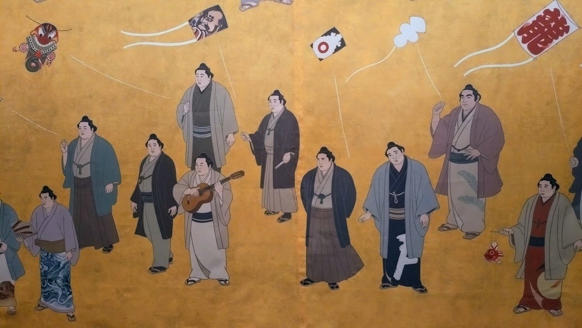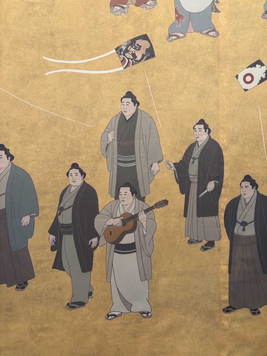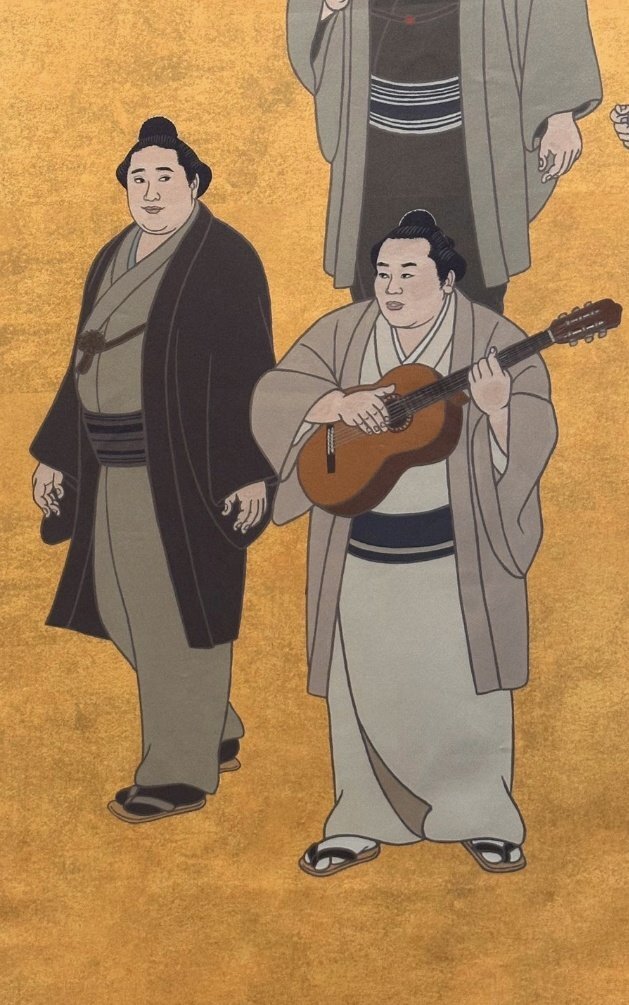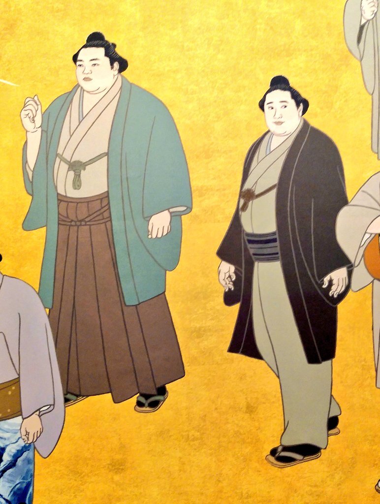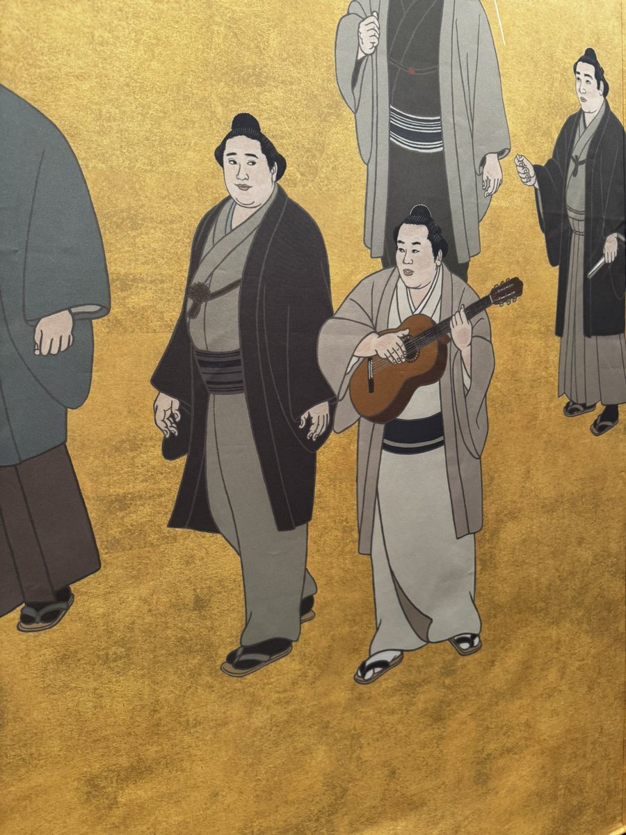 返信先:@wei_loveStella楽器を持っている玉の海の左が北の富士さんだと思います! 弾いたり歌ったりできたハイカラ横綱コンビ。 錦絵は左上からUターンして左下まで、歴代順に描かれているので、左が52代の北の富士さん、楽器を持っているのが51代の玉の海さんかと。