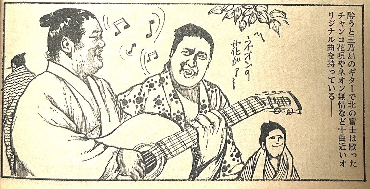 ちなみに歴代横綱の錦絵の写真数々で一番感動したのは、アコースティックギター構える玉の海関とその隣に北の富士親方が並んでいる場面だった(玉ノ海関は自分が生まれる前に亡くなっているし、北の富士さんも現役時代は知らなくて審判部長~NHK専属解説の印象が強いのだけど)