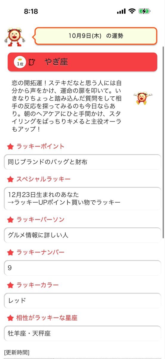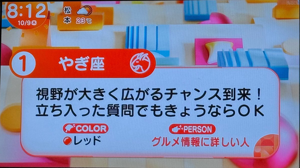 10月9日めざまし占い めざましのゲスト 新木10ドラマ「小さい頃は神様がいて」に出演の北村有起哉さん、仲間由紀恵さん 1位 やぎ座 10月1位2回目初 パーソン:グルメ情報に詳しい人 アドバイス:ヘアケアにひと手間かける スペシャルラッキー:12月23日生まれ Lucky POINT:バッグと財布 #めざまし占い pic.x.com/YXphOVcfoU