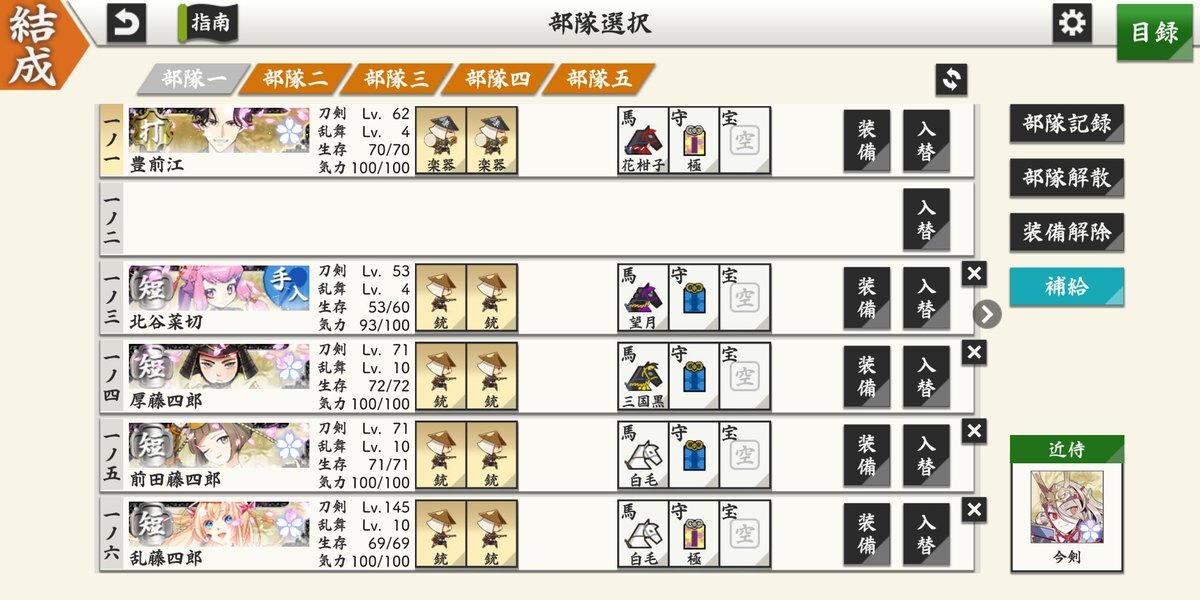 編成は自動周回やりやすいと見かけた、育てたい子(楽器兵)+極短刀4で回ってた。 北谷菜切だけ最初から最後まで固定で入れてて、他のメンバーはたまに入れ替えた有り。 少しレベル差のある北谷菜切だけよく橙疲労なってたけど、確かに放置周回しやすかった。 #柚子本丸日記 pic.x.com/XSvECSSgTC