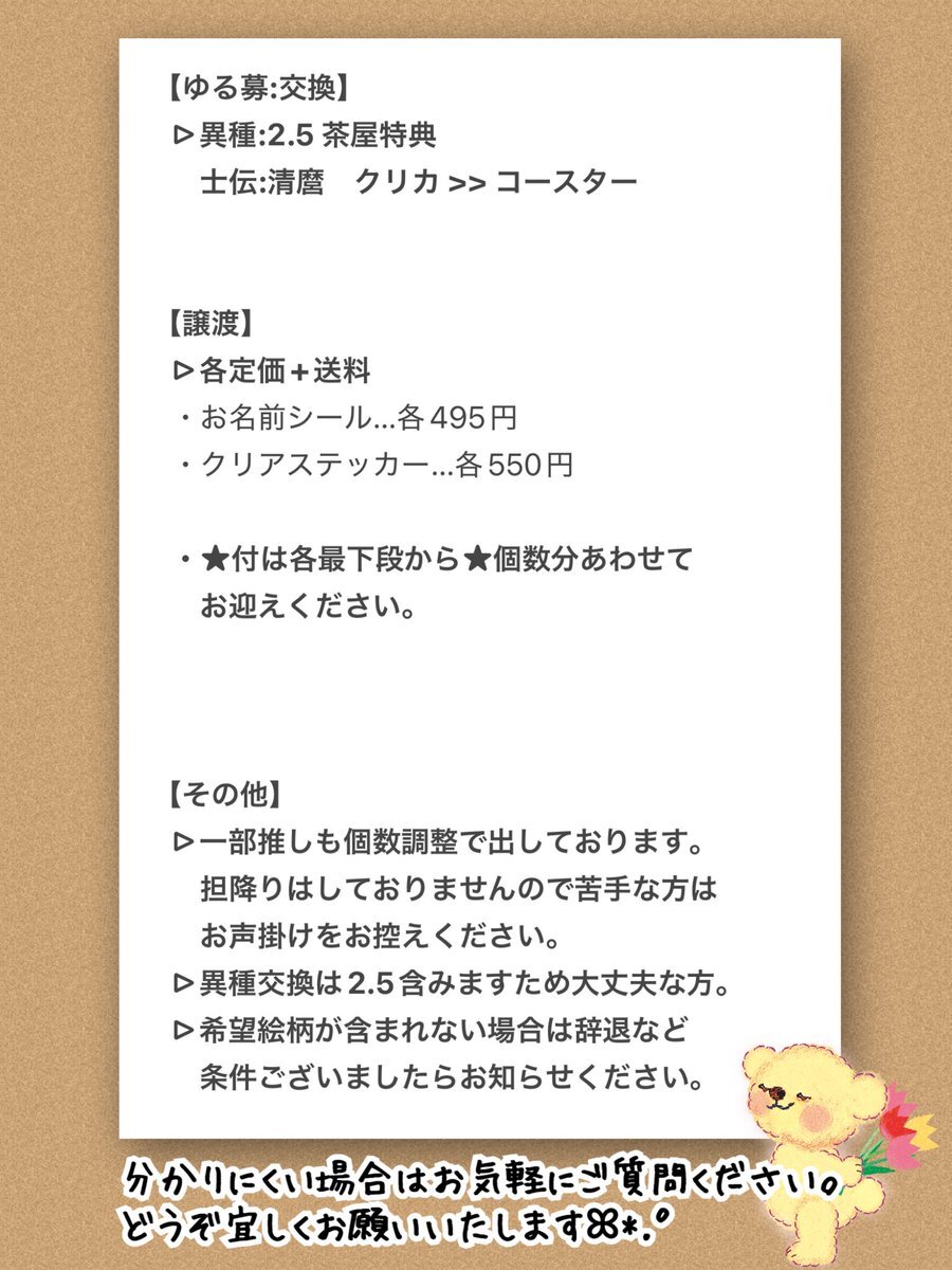 @a 交換 2.5茶屋 にご茶屋 祝賀祭 特典 クリアカード クリアシート コースター 譲┆ 刀ステ ★北谷菜切 ★ソハヤ 刀ミュ 巴形 陸奥守 大慶 膝丸 肥前 求┆クリカ 長義 !⇄1:譲2(★複数) 可 !★ ¥300(+送料)譲渡可 11/28 午後 TDC┆平日夜 新宿┆都内手渡 郵送 (リトリン参照) pic.x.com/ILxlAZuuF5