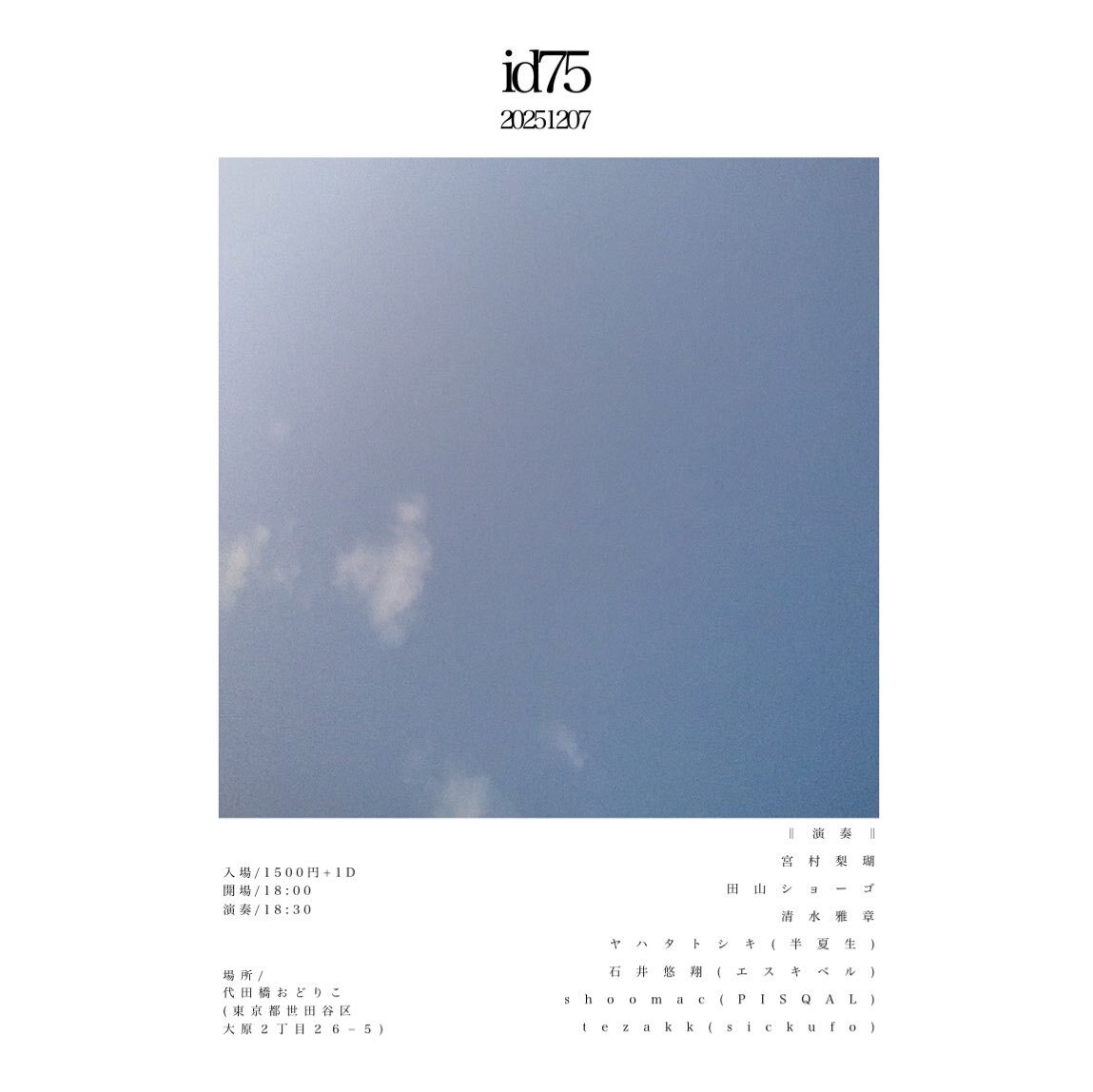 2025.12.07(日) id75 演奏/ 宮村梨瑚 田山ショーゴ 清水雅章 ヤハタトシキ(半夏生) 石井悠翔(エスキベル) shoomac(PISQAL) tezakk(sickufo) 入場/1500円+1D 18:00 開場 18:30 演奏 場所/ 代田橋おどりこ 〒156-0041 東京都世田谷区大原2丁目26−5 日曜です、ぜひ! すごく楽しみです💡 pic.x.com/8W0JssdRuv