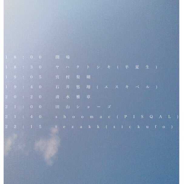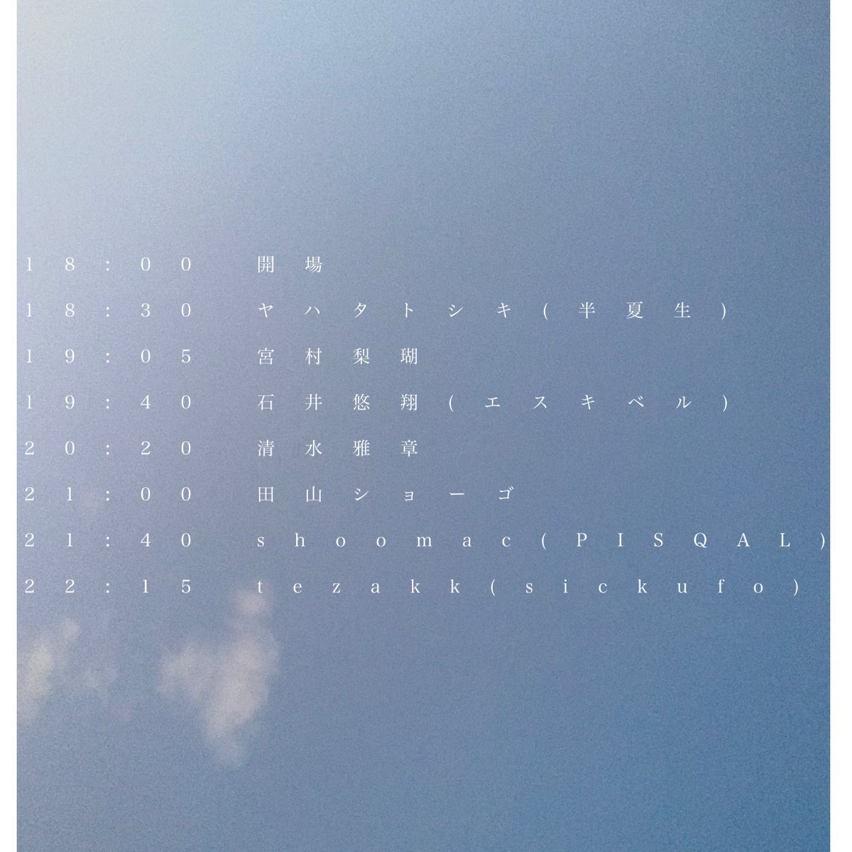12月7日(日)アコースティックギターと歌います 演奏/ 宮村梨瑚 田山ショーゴ 清水雅章 ヤハタトシキ(半夏生) 石井悠翔(エスキベル) shoomac(PISQAL) tezakk(sickufo) 入場/1500円+1D 18:00 開場 18:30 演奏 場所/ 代田橋おどりこ 〒156-0041 東京都世田谷区大原2丁目 pic.x.com/u1mSig6D0e