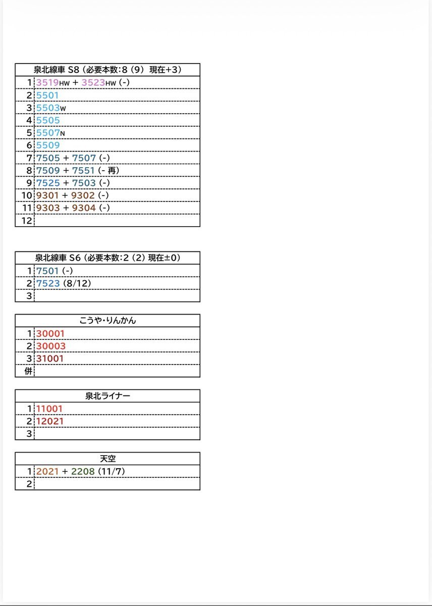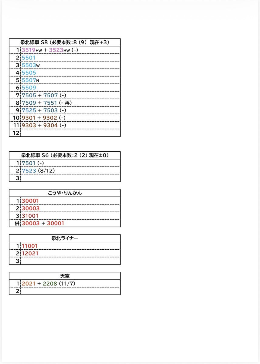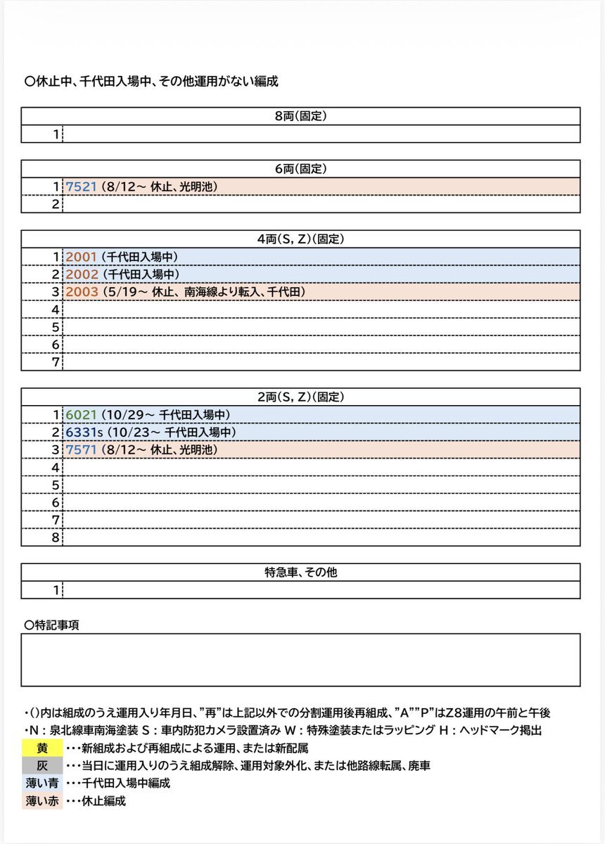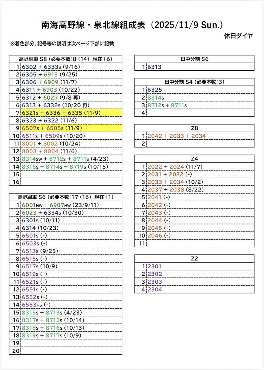 【南海高野線・泉北線組成表 2025.11.10】 ○本日の組成変更はありませんでした やはり浮浪気味で安定しない6325F。6331Fが入場して以降ほとんどの期間で単独生活。 #南海組成 pic.x.com/f24mpPAdZv