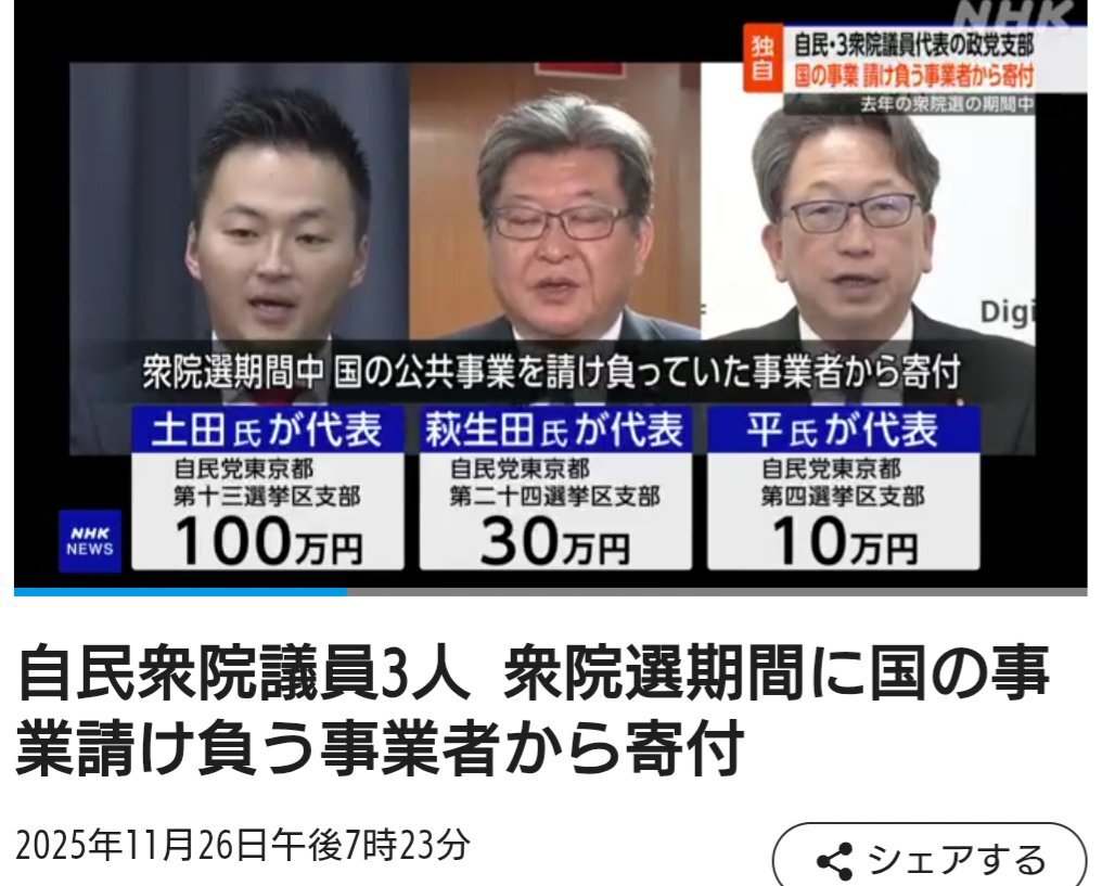 【速報】麻生派からの寄付各100万円を記載せず 2025年11月28日 共同通信 >長坂康正厚生労働副大臣と高橋克法総務副大臣の自民党支部が、麻生派からそれぞれ受け取った100万円の寄付を政治資金収支報告書に記載していなかったことが28日、分かった。 47news.jp/13520842.html?… @47news_official