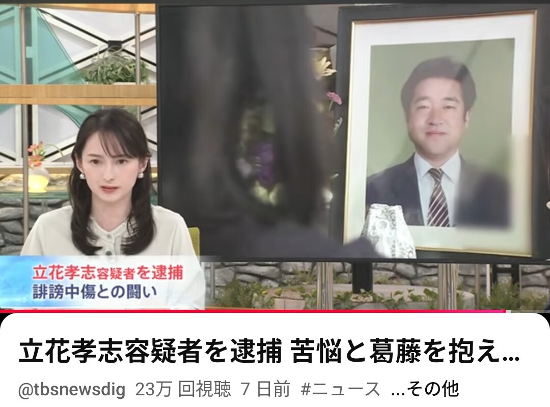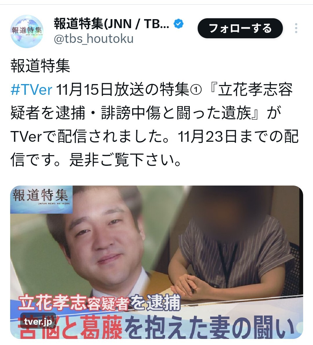 TBS の報道特集 ずるいよな、 亡くなられた竹内県議や 逮捕された立花さんがどっちがいいか悪いかはこれから裁判で明らかになると思うが、報道特集のずるいところは一方の意見しか聞かないし報道しかしない。 立花さんを報道や意見を話すことさえしない、そこが必要でずるい。