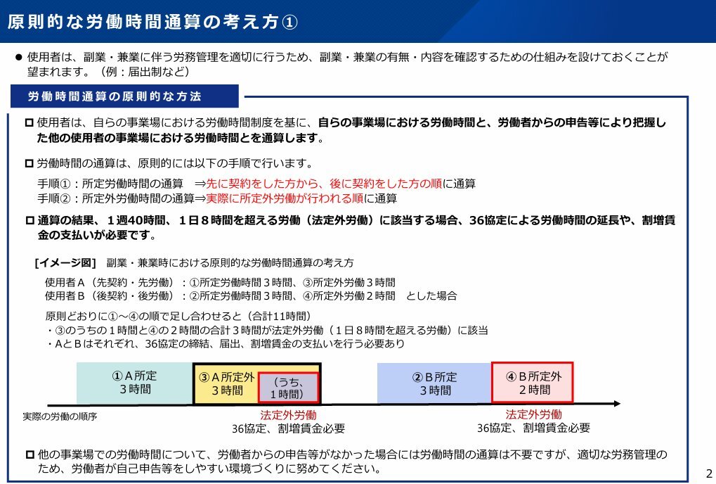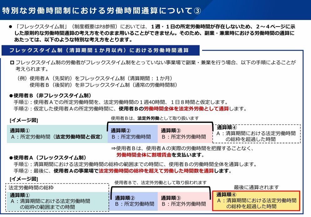 厚生労働省の「副業・兼業」に掲載されている 副業・兼業における労働時間の通算について です ・他の事業場での労働時間について、労働者からの申告等がなかった場合には労働時間の通算は不要です と明記されているのとフレックスタイム制の考え方が興味深いかと #副業 mhlw.go.jp/stf/seisakunit… pic.x.com/DetBxNWxuQ