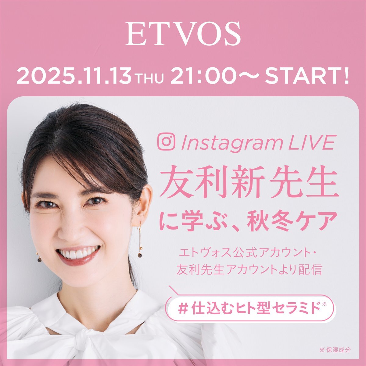 \ETVOS Instagram LIVEのお知らせ/ 明日開催!21:00~インスタライブ配信📱 友利新先生をお招きして、秋冬ケアについて教えていただきます🧴🫧是非ご参加ください👀✨ ▼視聴はこちらから bit.ly/3MzKWVG ※配信開始時刻は前後する可能性があります pic.x.com/mKjVUZ54cm