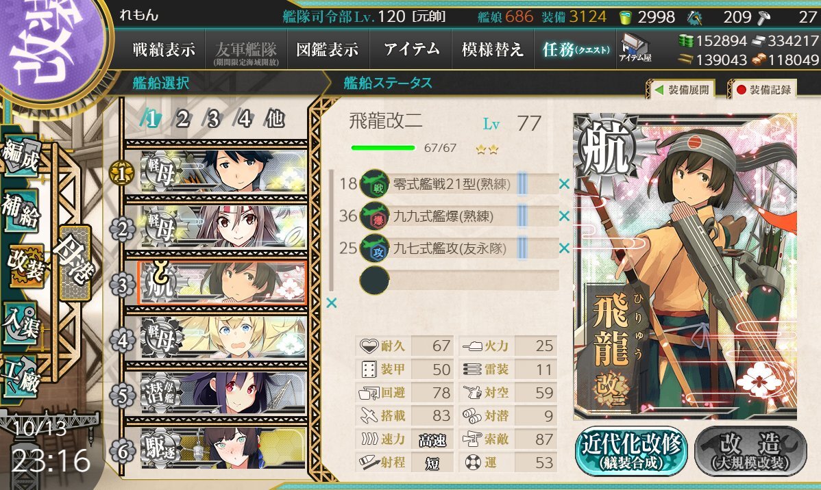 返信先:@Enju_Akaga1942最初の2年ひたすら2-3だけ周り続けて、飛龍牧場し続けた結果です 熟練搭乗員の都合上まだ6しか天山にしてませんが、倍の数まだ友永の控えあります ちなみに、村田隊はまだ任務着手してないですね 使わなくても何とかなってしまうので、改装実装待ちしてます