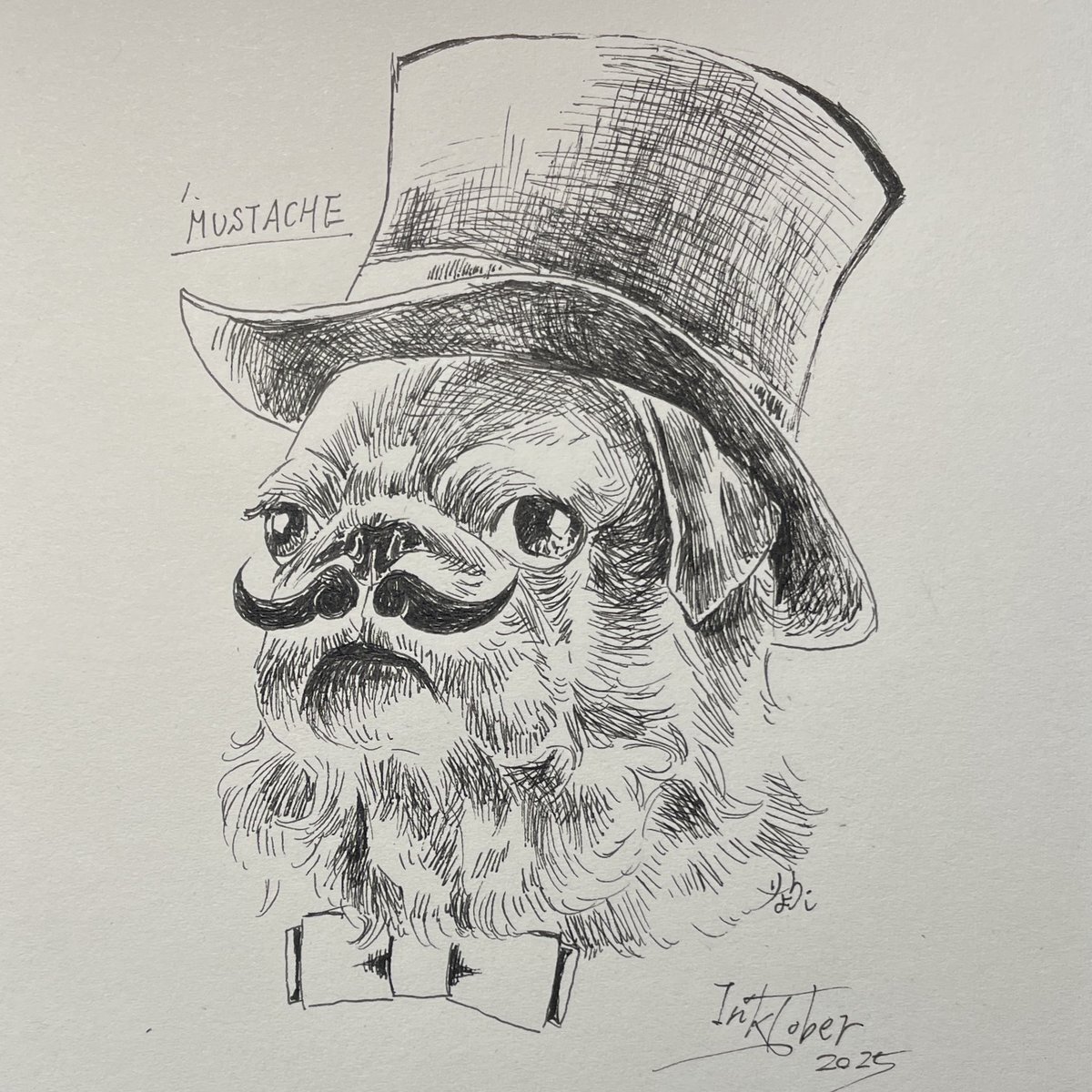 インクトーバー(未消化のやつ) 1、口ひげ 口ひげ、シルクハット、蝶ネクタイときたらモノクルも欲しいけど…パグは目が出てるからなぁ… ベタ用にいい感じのペンとかも探そ…どっか家ん中ないかな。 #inktober #inktober2025 pic.x.com/huq7N9En57