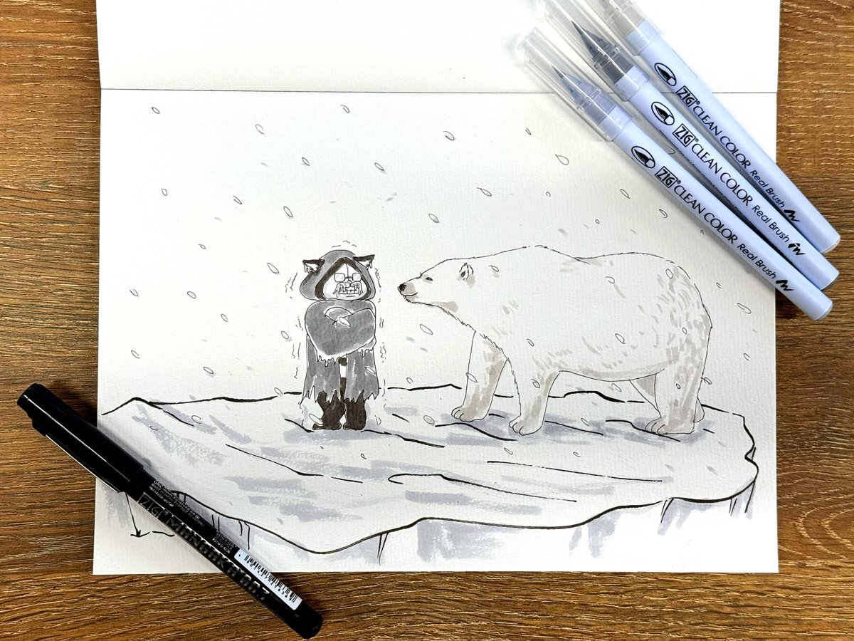 長編物語【口ひげの猫と光の森】 📆10月19日(日)北極の、極寒の ディーラーとの勝負に負けたエコなご。 でも地下からの抜け道を教えてくれたみゃ! 抜けた先は極寒の地🥶❄️🐻❄️ #inktober2025 #kuretake_inktober2025 #inktober_PerfectChallenge #エコなごインクトーバーチャレンジ pic.x.com/M2GJGXO50W