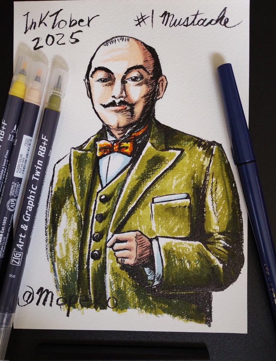 ♯1口ひげ ポアロさん(模写) 超スロースタートで参加開始w 「口ひげ」と言えばこの方。 まあ子供の頃はヘイスティングス推しでしたがw 使用画材 用紙:マルマン特厚口画用紙 主線:呉竹万年毛筆写経用八五号 彩色:アート&グラフィックTW RB+F(10色) #インクトーバー2025 pic.x.com/GZOvzY2iei